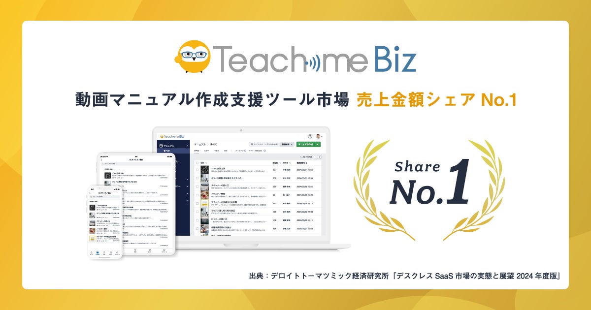 クラウド型のマニュアル作成・共有システム「Teachme Biz(ティーチミー・ビズ)」は、企業のマニュアルの作成、管理を効率化することで、生産性を大きく向上させるソリューションです。手順書の作成時間を大幅に削減するだけでなく、人材育成効率化や顧客満足度の向上など様々な成果が報告されており、1社あたり月額 59,800円(税抜)から利用可能です。デロイト トーマツ ミック経済研究所による『デスクレスSaaS市場の実態と展望 2024年度版』における「動画マニュアル作成支援ツール市場」の調査では、すべての業種、ユーザー規模において売上金額シェアNo.1を獲得しました。