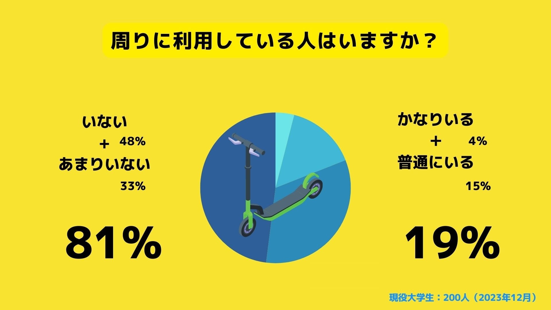 周りにLUUPを利用している人がいるかという調査でも「いる」は19%に留まり、未だ普及しているとは言えないようです。