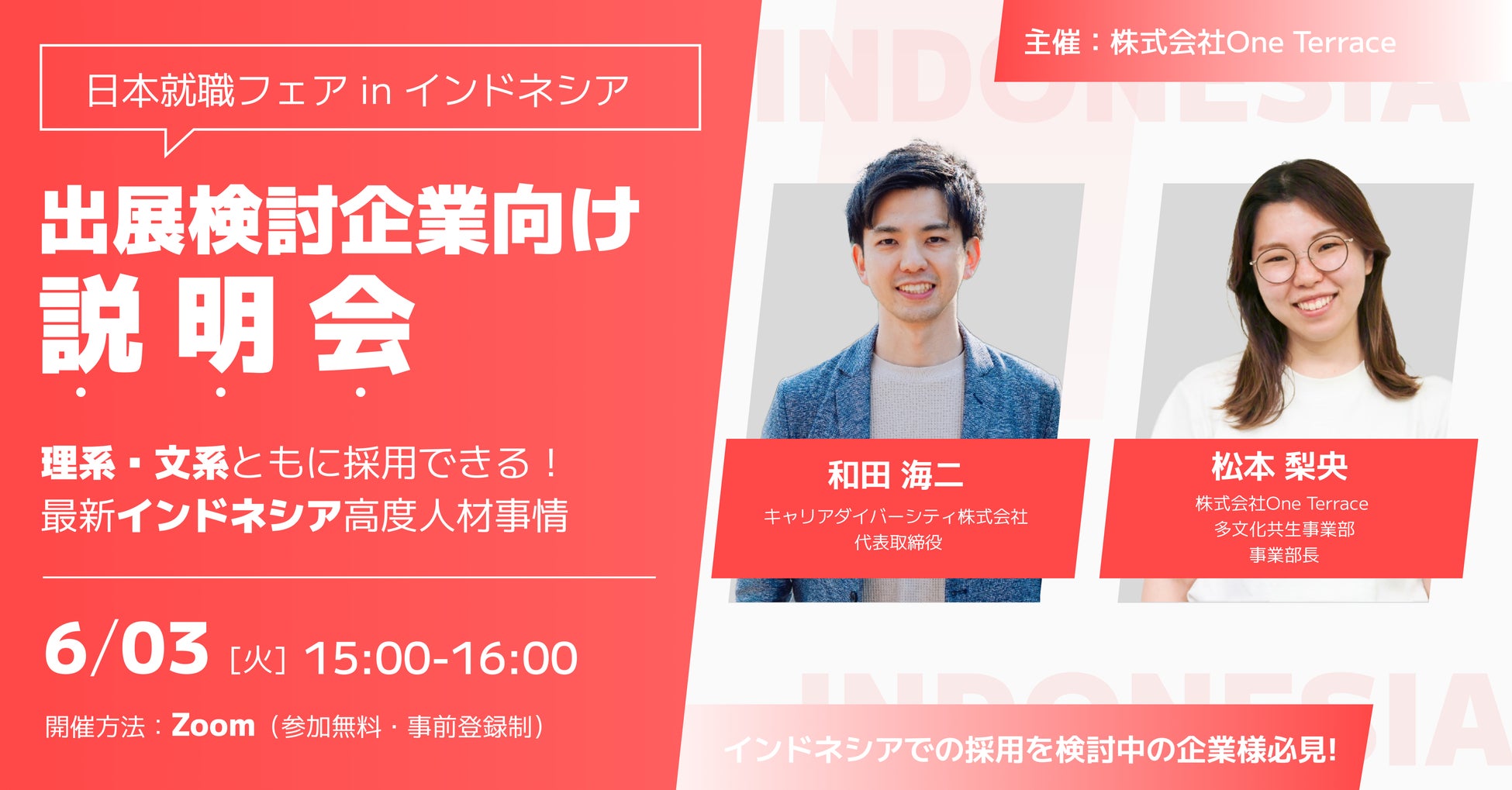 外国人材の紹介・育成を行う株式会社One Terrace(本社:東京都港区、代表取締役:石中達也)は、本年7月にインドネシア・ジャカルタ現地で開催予定の「インドネシアジョブフェア2025」に向けて、出展をご検討中の企業様向けオンライン説明会を開催いたします。