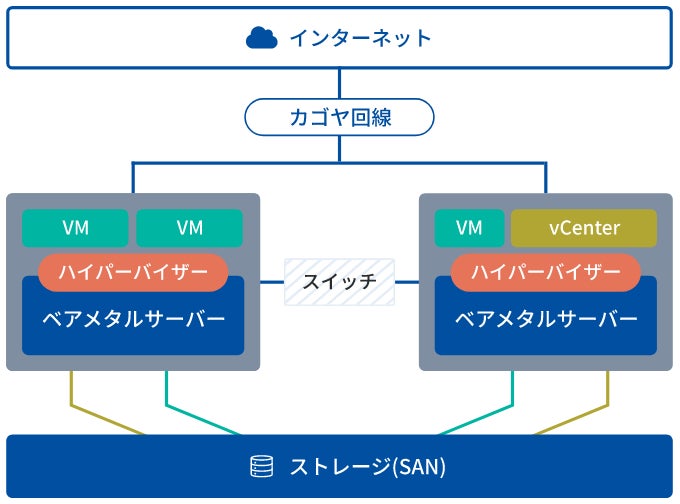 KAGOYA FLEX 「プライベートクラウドパッケージ HA」 は、冗長構成のホストサーバーと共有ストレージで構築されたvSphereベースの仮想環境を提供しています。ライブマイグレーションにも対応した障害に強いプライベートクラウド環境を設定作業の費用や工数をかけずに簡単に導入いただけます。
