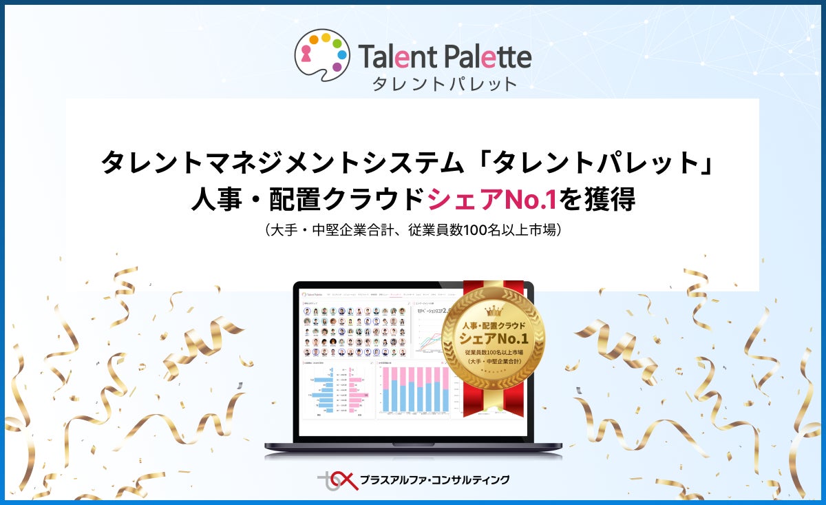 株式会社プラスアルファ・コンサルティング(本社:東京都港区、代表取締役社長:三室克哉、証券コード:4071)が提供するタレントマネジメントシステム「Talent Palette(以下:タレントパレット)」は、デロイト トーマツ ミック経済研究所株式会社(本社:東京都千代田区、代表取締役社長:有賀章)の発行する市場調査レポート「HRTechクラウド市場の実態と展望2022年度版」ユーザー規模別人事・配置クラウド売上高において、ベンダー別売上金額シェアNo.1 (大手・中堅企業合計、従業員数100名以上市場)を獲得しました。