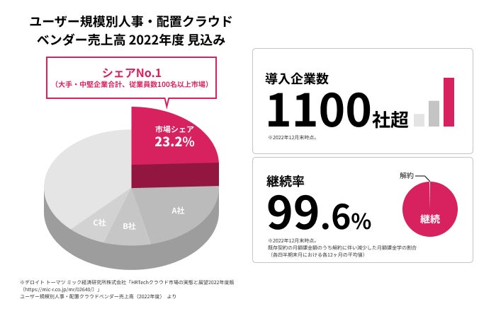 ※上記、市場シェアに関しては、デロイト トーマツ ミック経済研究所株式会社が発行している「HRTechクラウド市場の実態と展望2022年度版(https://mic-r.co.jp/mr/02640/)」に記載された内容を引用したものです。