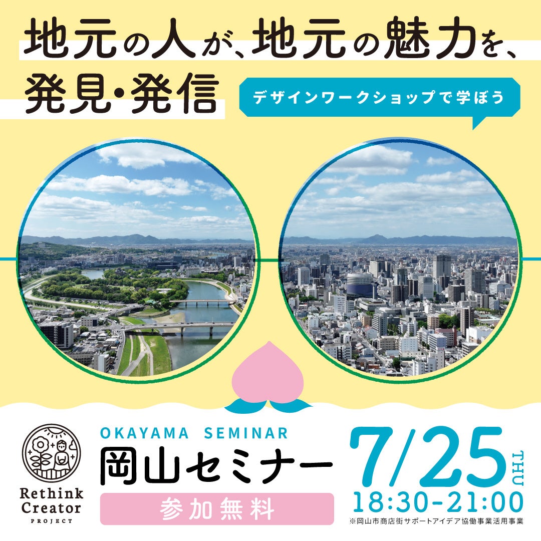 岡山セミナーは、岡山市商店街サポートアイデア協働事業として岡山市中心部の商店街とも協働して実施するとともに、岡山市の後援、クリエイターズマッチの主催、「Rethink PROJECT」の協賛のもと岡山市で初めて開催します。
