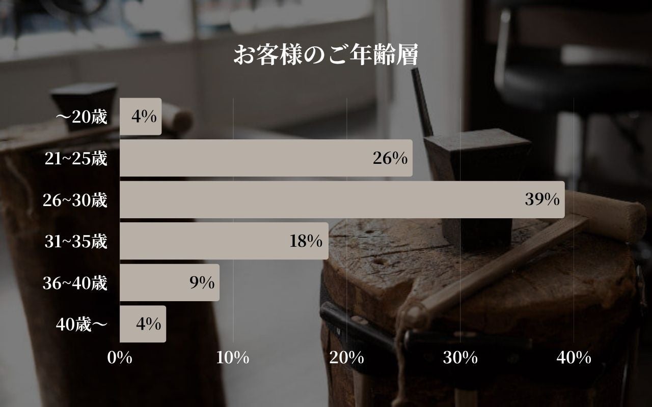 一方で、36歳以上の層も合計で12.9%を占めており、結婚記念日などの節目におけるセカンドマリッジリングやファミリーリングといった、より多様でパーソナルなニーズにも当店が応えられていることが確認できました。当店は、人生の特別な節目を飾る体験を通じて、幅広い年代のカップルに支持されていると分析できます。
