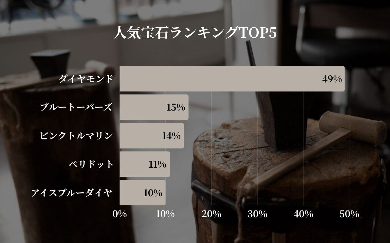 一方、ダイヤモンドに続く2位以降は、ブルートパーズ(15%)、ピンクトルマリン(14%)、ペリドット(11%)、アイスブルーダイヤ(10%)と、カラーストーンや加工されたダイヤモンドが上位を占める結果となりました。特にブルートパーズとピンクトルマリンは、色合いが美しく、それぞれ11月と10月の誕生石であることから、パーソナルな意味を込める目的で選ばれている傾向が強いと推察されます。