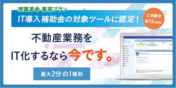 ITツール導入時にかかる費用の1/2が補助される!不動産売買の煩雑な業務と集客を強力にサポートする「売買革命 集客プラン」がIT導入補助金の対象ツールに認定されました。