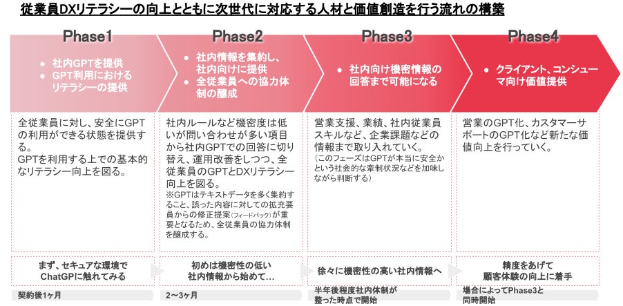アルサーガパートナーズは、企業がGPTを導入するプロセスとして以下の四つのフェーズで進めることがビジネス戦略としてベストプラクティスだと考えています。