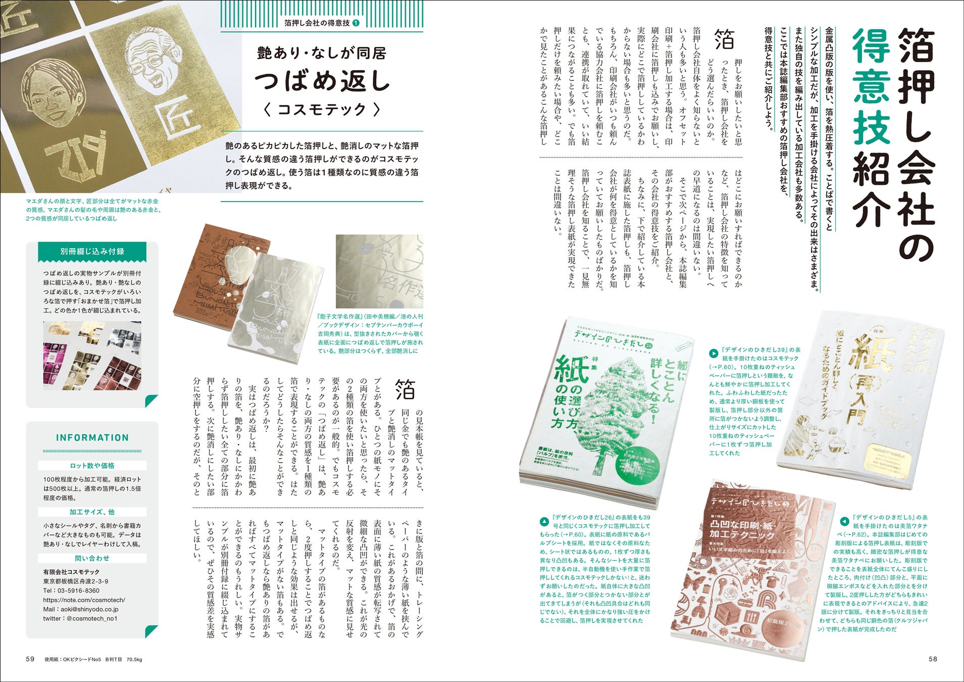自分の発想したデザインを、いかに効果的に印刷/加工表現するか。そんなデザイナーに必須な印刷・紙・加工などの技術情報をわかりやすく紹介する『デザインのひきだし』。46号となる今号の特集は「印刷・紙加工の大百科 箔押し&箔加工編」として、印刷や別の加工では出せない、本物の金属のピカピカ感が出せる箔を使った加工を徹底大特集。箔押しってなに? というルポから箔の種類、箔押しの各種テクニック、多様な箔加工の数々をあますことなく掲載。箔を知りたい人必見の1冊です!