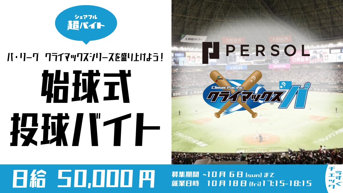 今回募集を行う超バイト企画は、2024年10月18日(金)にみずほPayPayドーム福岡にて行われる「パーソル CS パ ファイナルステージ 第3戦」の始球式にて投球する超バイトです。当選者には非日常を味わえる特別な体験と、当日の観戦チケットなどの特典が与えられます。