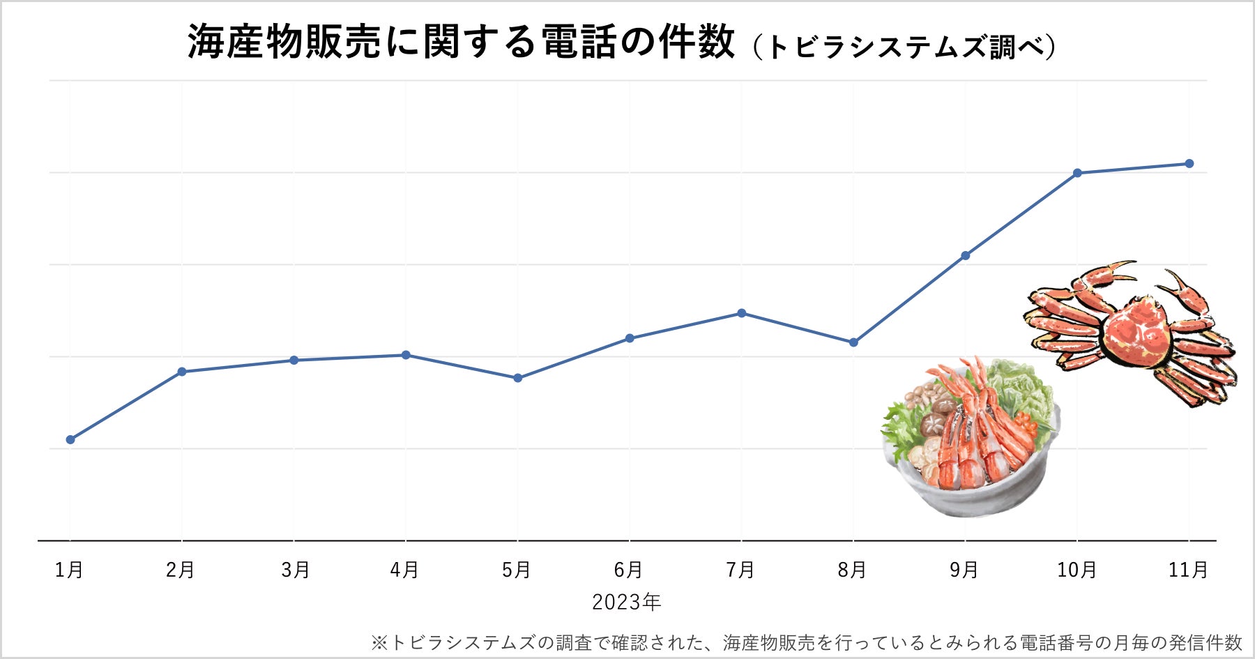 トビラシステムズの調査では、海産物販売に関する電話が増加傾向にあります。特に、ALPS処理水海洋放出が開始された2023年8月以降大きく増加しています。