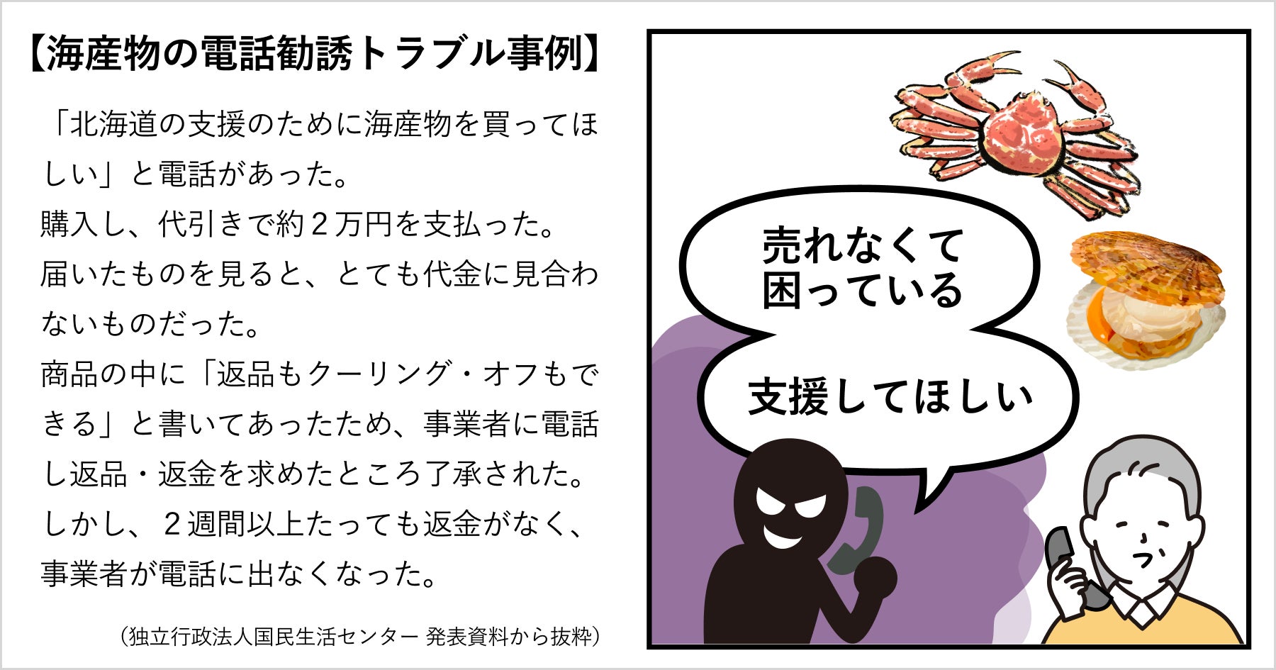 家族や親戚、友人などの集まりが増える年末年始は、海産物などの食材購入が増えやすくなります。そんな年末年始に特に気をつけたいのが、海産物の電話勧誘トラブルです。