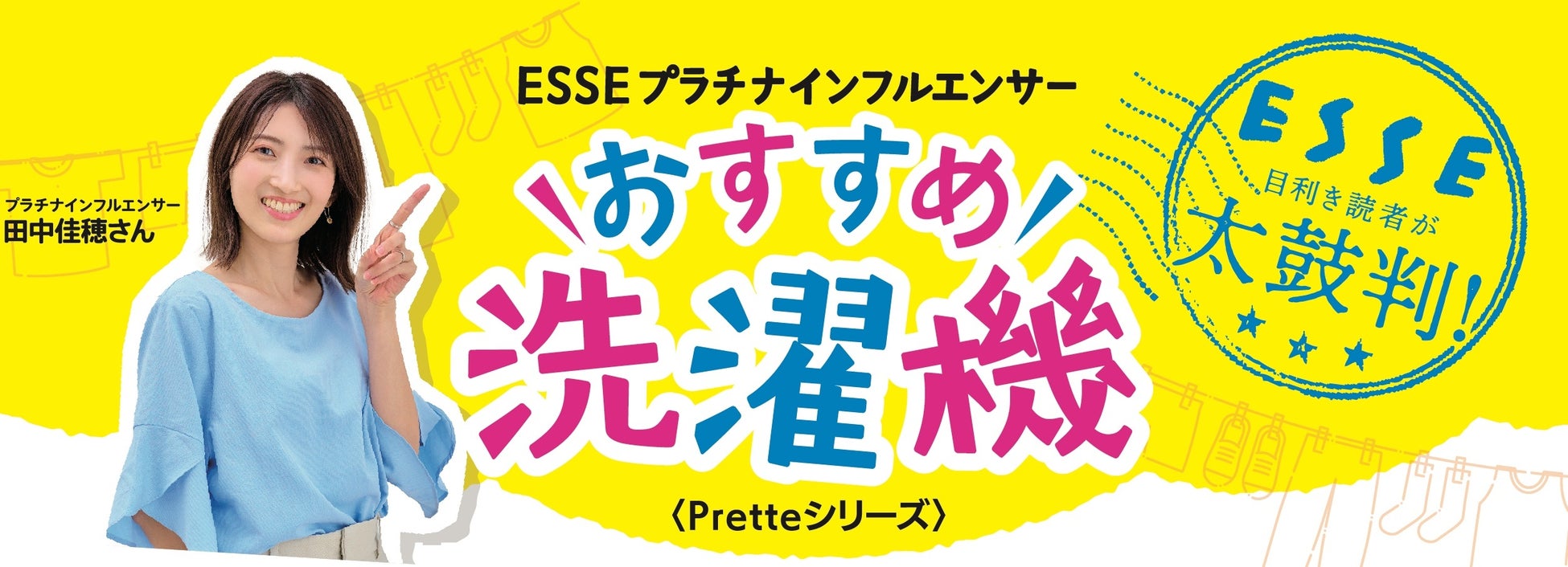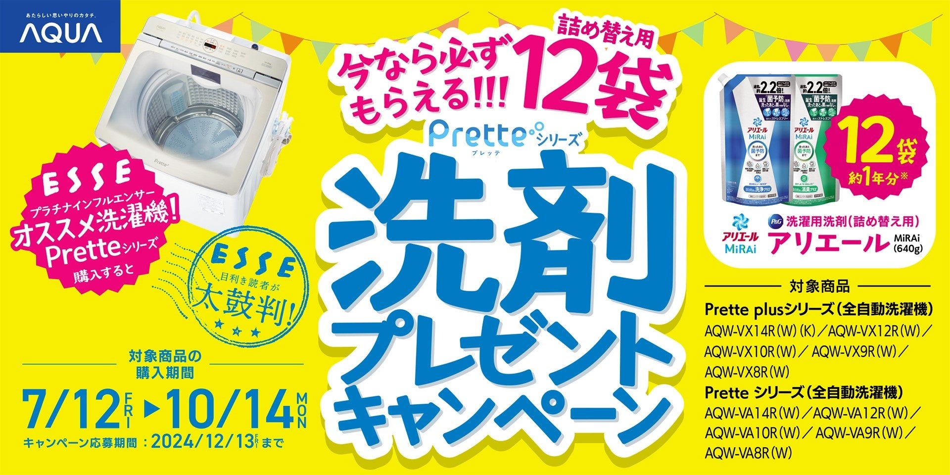 今回のキャンペーンでは、生活情報誌「ESSE」(扶桑社)のプラチナインフルエンサーたちがAQUAのおすすめ製品として全自動洗濯機「Pretteシリーズ」をピックアップ!2024年7月12日(金)~2024年10月14日(月祝)の間に、「Pretteシリーズ」の最新機種をお買い上げの上、キャンペーン期間中に購入レシートのコピーを添えて郵送またはWEBにて応募いただいた方全員に、詰め替え用の洗濯用洗剤12袋をプレゼント。さらに、応募者の中から抽選で10名様に【ESSE賞】としてESSE年間定期購読1年分(12冊)、100名様に【AQUA賞】としてランドリーバスケットタワーをプレゼントいたします。