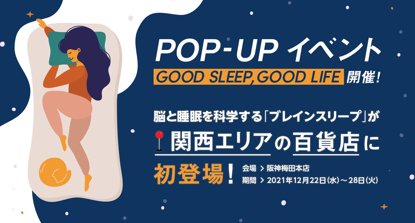 株式会社ブレインスリープ(本社:東京都千代田区、代表取締役:道端孝助、以下「ブレインスリープ」)は、関西エリア初、「Good sleep,Good life」をテーマにしたポップアップイベントを阪神梅田本店にて2021年12月22日(水)から28日(火)までの期間限定で開催します。本ポップアップイベントでは、”寝具”としてのカテゴリーではなく、”ビューティ&ヘルス”のカテゴリーとして、お客さまご自身の睡眠状態をチェックできる「睡眠タイプ診断」コーナーを設置し、睡眠への理解を得た上で商品を体験いただくなど、睡眠を軸にした質の良いライフスタイルをご提案します。