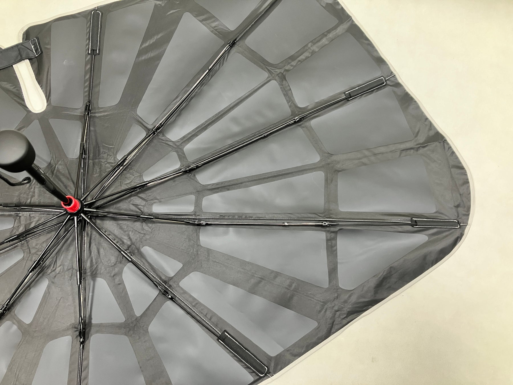 「MTKノーブルサンシェード」に施されている特殊加工は、サンシェードの生地の裏側に、特殊加工を施したPETパネルを44枚も貼り付けています。折りたたんだ際の形状などが綿密に計算された配置で貼り付けられているため、折りたたみ時にスムーズに元の形に戻り、難なく収納することが可能になっています。