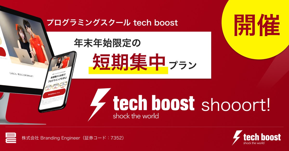 株式会社Branding Engineer(所在地:東京都渋谷区、代表取締役CEO:河端保志、代表取締役COO:髙原克弥、証券コード:7352、以下Branding Engineer)は、運営するプログラミングスクールtech boost(以下、tech boost)にて、年末年始の短期集中プランとして「tech boost shooort!」を開催することをお知らせいたします。