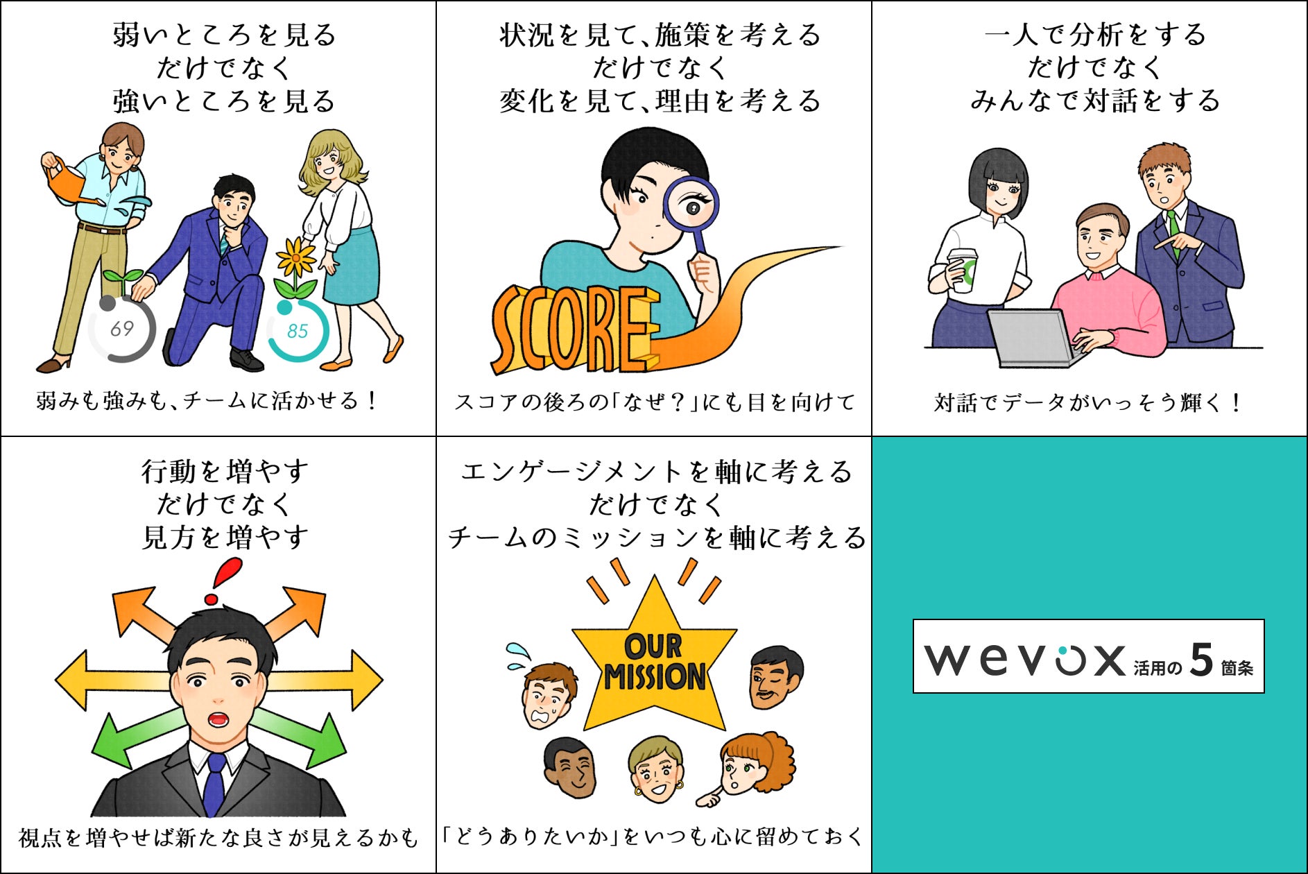 Wevoxをご活用いただくユーザーさまより「Wevoxを使う上で大事にすべき行動があるようだが、暗黙的でちょっと分かりづらい…。」という一言をいただいたことがきっかけです。 Wevoxのスコアを見る上でどういった行動を取ると良いのかをより明確にできれば、今よりエンゲージメント向上に活かせる方が増えるのではないか、その一心で、Wevoxのスコアを分析していただく際に必要な「Wevox活用5箇条」を作成いたしました。