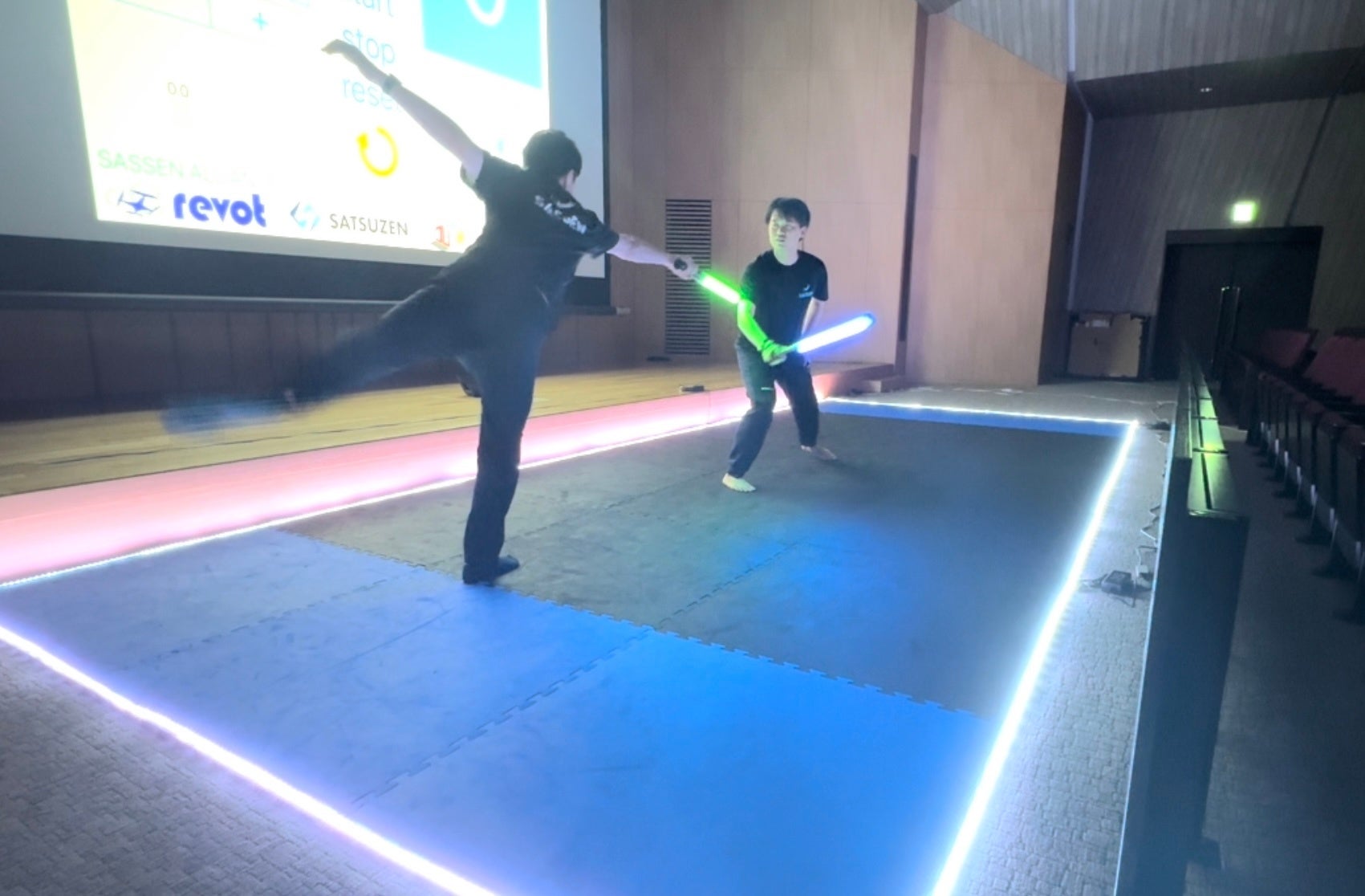 • インタラクティブな演出:フィールドLEDは、プレイヤーの動きや攻撃に応じてリアルタイムで色を変えるなど、動的な演出を行います。特にプレイヤーの刀と連動して光るため、どちらにポイントが入ったかが瞬時に視認でき、観客にもわかりやすいです。