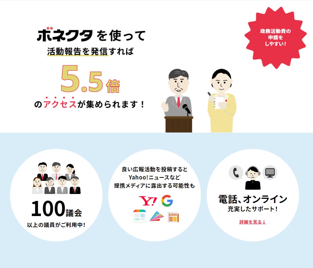 同プランは、弊社が提供してきたネット上での政治活動を支援するサービス「ボネクタ」の機能の中から議員・議会活動を支援する機能の利用料金に、自治体が議員に支給する「政務活動費」を充当できるプランで、ネットを活用して広報・広聴活動が効果的に行われるような各種機能を追加実装しております。市民の情報源としてネットが勢いを増す中で、弊社は今後も議員の皆様によるネットを介した市民・地域からの情報収集や意見交換を後押しすることで職責を全うできる環境づくりを目指し、「ボネクタ議会・政務活動プラン」を広げられるよう、努めてまいります。