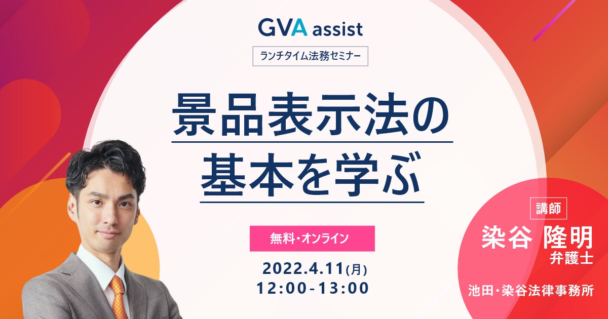 リーガルテックサービス「GVA」シリーズを提供するGVA TECH株式会社(本社:東京都渋谷区、代表取締役:山本 俊、以下GVA TECH)は、2022年4月11日(月)12時から、池田・染谷法律事務所(所在地:東京都千代田区)の染谷 隆明弁護士に登壇いただき、「景品表示法」について解説いただくセミナーを開催することをお知らせいたします。