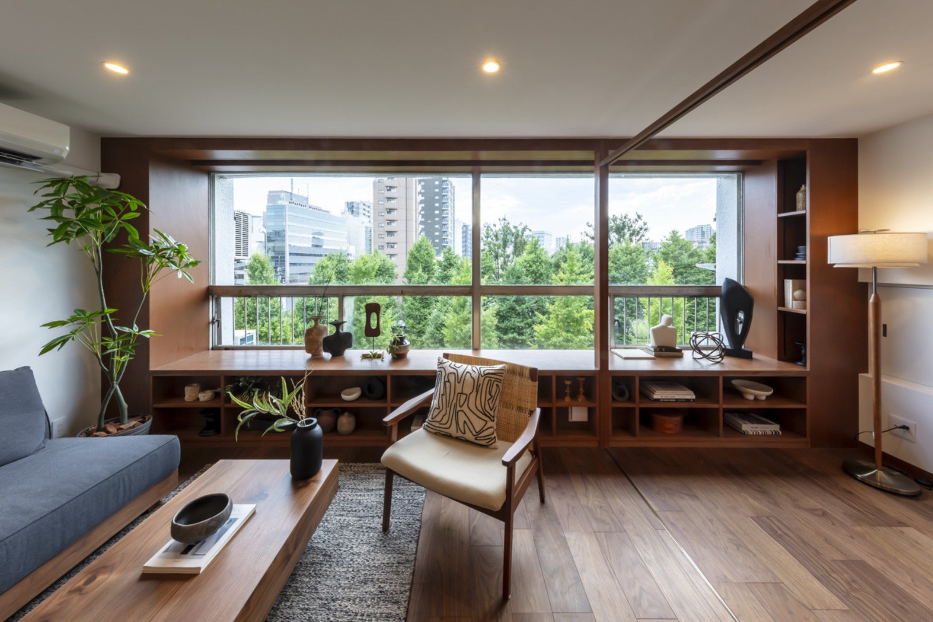 物件の写真を見た時に「マンションだな」と感じさせる2大要因は、天井の梁と窓枠の金物だと私は思っています。こちらの事例は存在感のある木材の棚を窓際に造作することで、窓枠や構造体の印象がほぼゼロになって、まるで素敵な一軒家の邸宅のようです。また、ミッドセンチュリーを感じさせる赤茶系の木材で、障子、引き戸、縁側、和室など日本式の建て具を造作した「ジャパンディ」感が最高にわたくし好み。買取再販でここまでハイセンスな内装を実践できることにも驚きました。センスの塊!