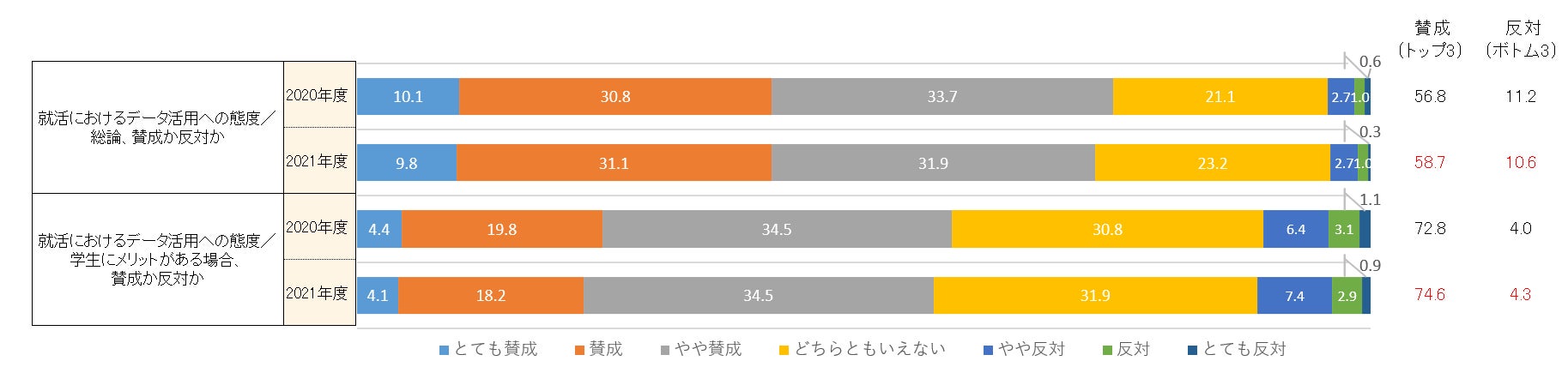 ・学生にメリットがある場合は、賛成(トップ3ボックス)は2020年度の72.8%から2021年度は74.6%へ増加、反対(ボトム3ボックス)は2020年度の4.0%から4.3%の微増となりました。