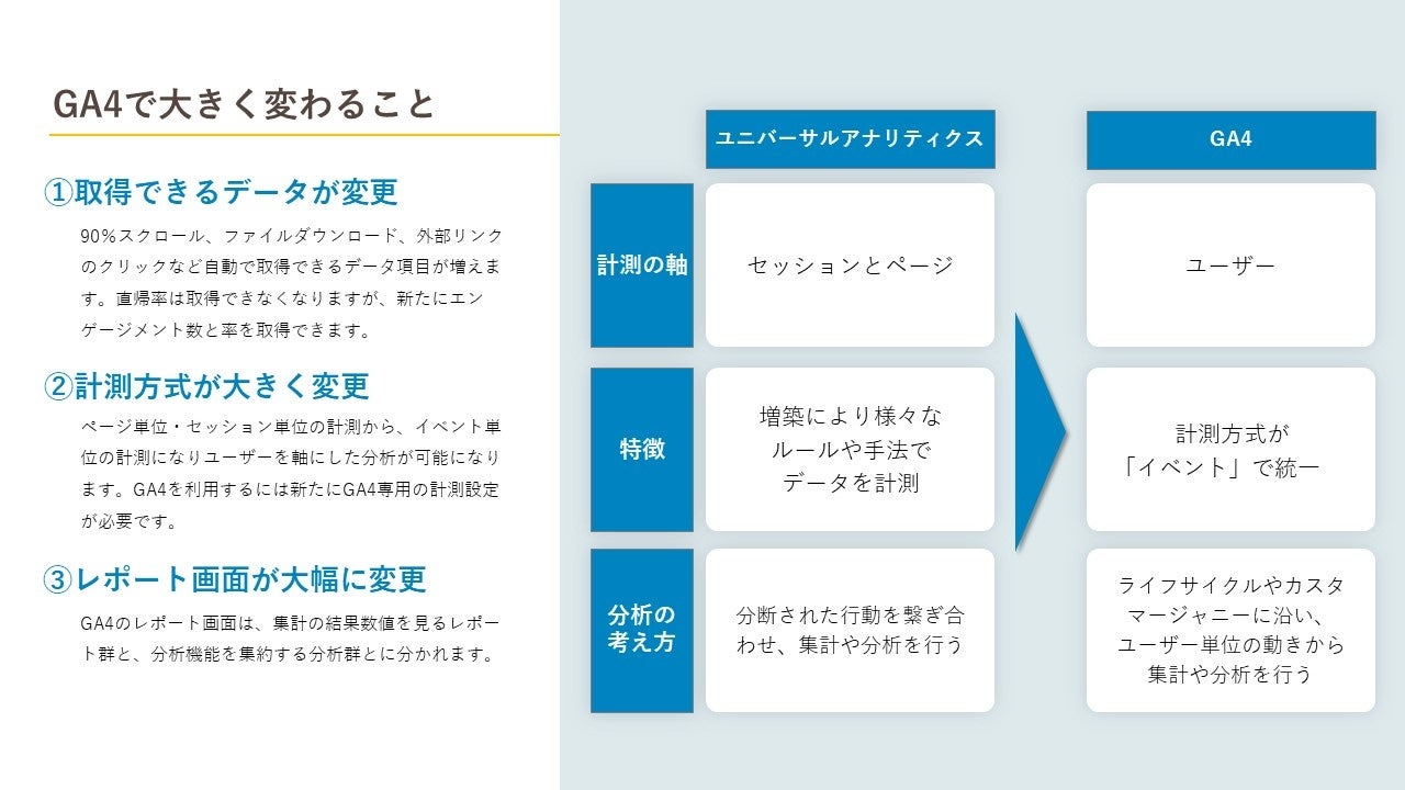 概要:来年7月1日に計測停止がアナウンスされたGoogle Analytics。GA4へのアップデート内容や、レポート・分析ハブなどの使い方を紹介いたします。