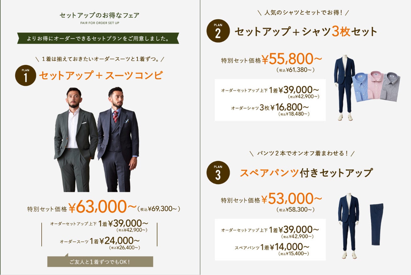 ※…コンビ価格とはオーダースーツ2着以上ご購入していただいた場合の1着あたりのお値段です。組み合わせは自由ですので、異なる価格帯のオーダースーツと組み合わせていただいても本価格が適用されます。(2022年11月時点の価格です)