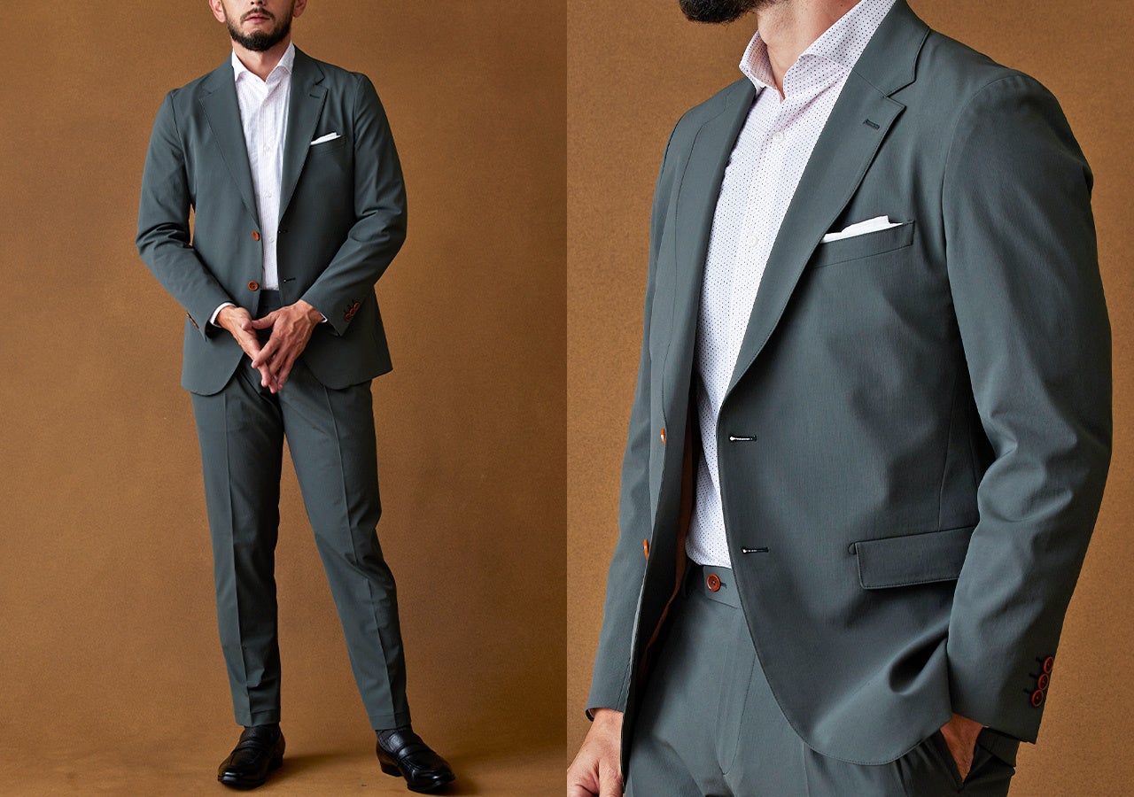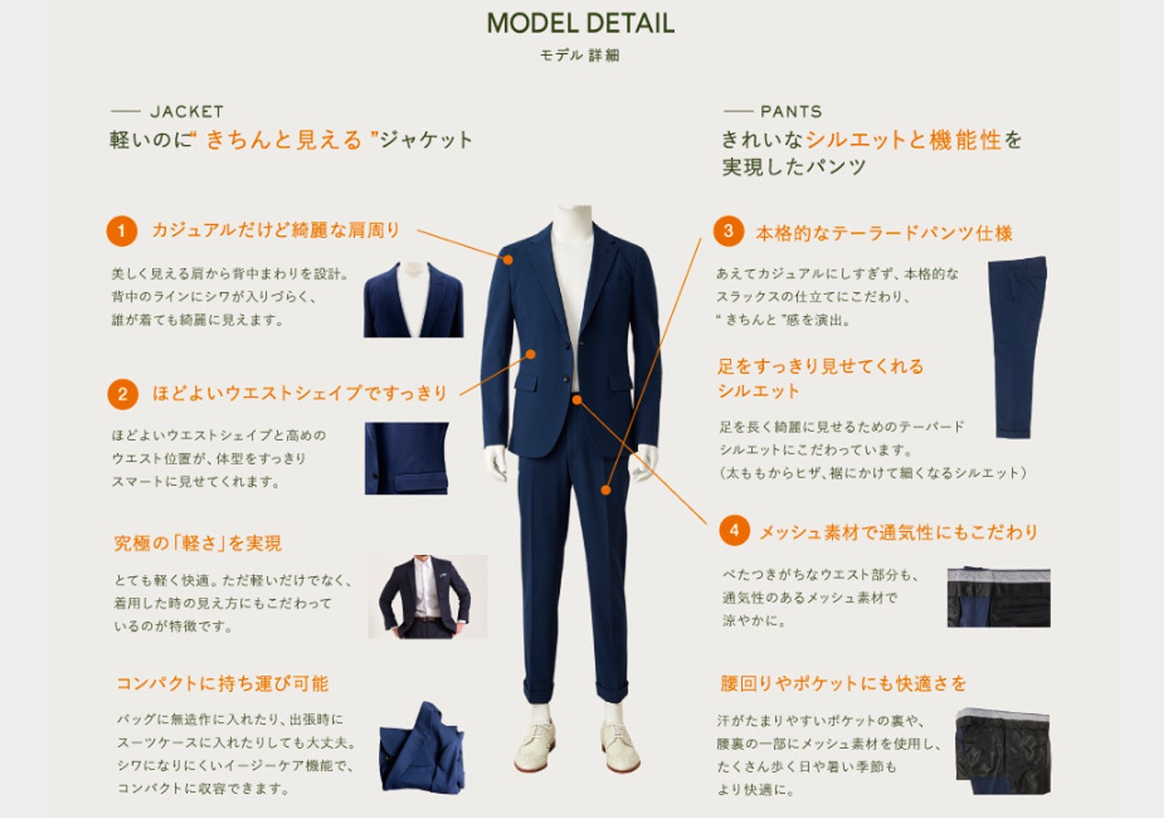 多くのビジネスマンにスーツを提供してきたオーダースーツ専門店だからこそできる、既製服では実現できない「軽くて動きやすい心地」と「美しいシルエット」のいいところどりを実現いたしました。