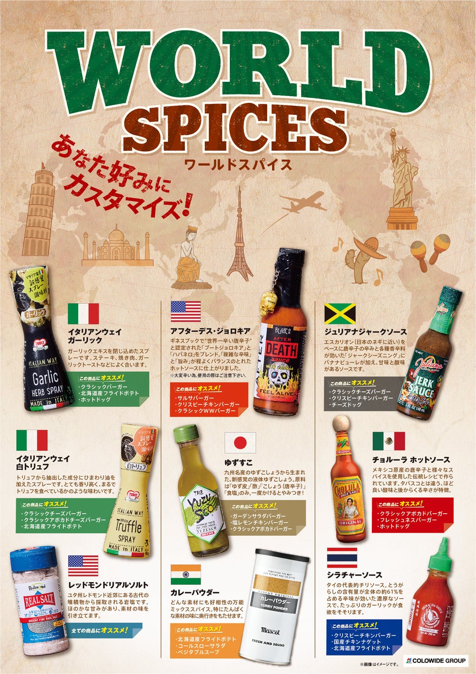 ハンバーガーやサイドメニューなど、そのままの美味しさをお楽しみいただいた後に、お好みのスパイスを使ってカスタマイズすれば、ひと味違った味わいに!!自分好みの美味しい食べ方を発見してみてください。