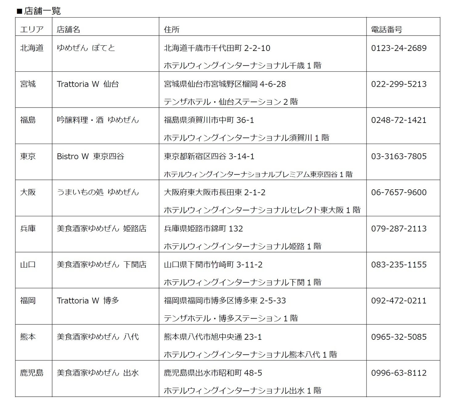 ホテルウィングチェーン直営レストラン・居酒屋 全国9店舗で開催