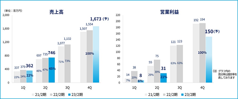 なお、2023年2月期第1四半期より「収益認識に関する会計基準」(企業会計基準第29号)等を適用しているため、Webマーケティング事業のうちWeb広告取引に係る売上を純額表示に変更しています。そのため、本発表においては、比較のため、過年度の売上高を当該会計基準等適用後の数値に置き換えて表示しております。売上総利益以下の各段階利益の金額には影響はなく、純額表示への変更により売上高利益率は改善しています。