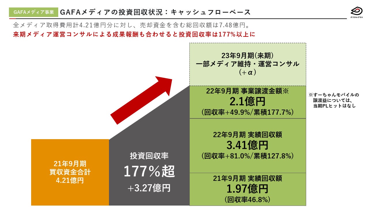 GAFAメディア事業部は、漫画大陸・すーちゃんモバイル比較を始め合計4.21億円分のメディア買収を行ってまいりましたが、その後同メディアの運用を通じて生み出されたキャッシュフロー及び売却による譲渡金額含めた投資回収率は177%超を達成し、期中の収益に大きく貢献しただけでなく、来期以降新たな領域の買収資金を十分に確保することができました。なお、すーちゃんモバイルの譲渡益に関しては、来期に引き続き同メディアの運用コンサルティングを行うこととなっているため、当期の特別利益として認識されず、来期以降に繰り延べられることになりましたが、来期以降は営業利益として認識される予定です。