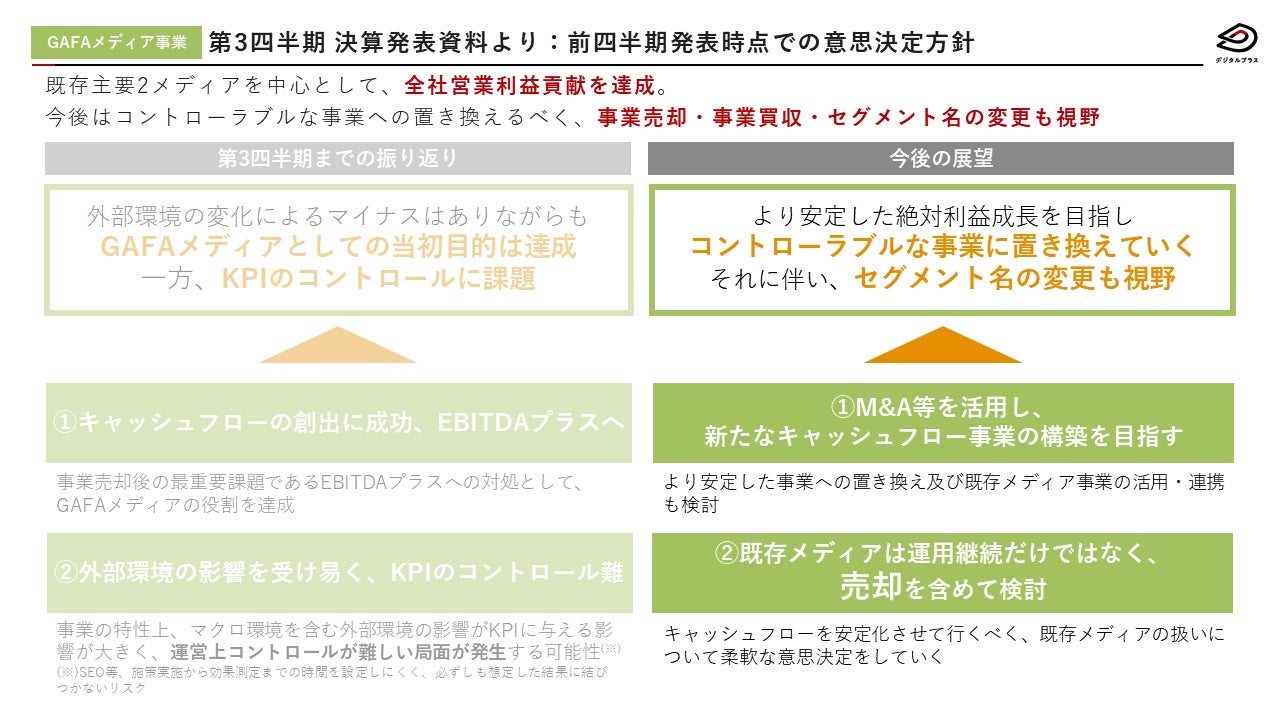 当社グループは2018年度より抜本的な経営改革を決定、推進してまいりました。そのような状況において、新たなる飛躍の為、10年後も成長し続ける生産性の高い新たな事業モデルの創出を目的として、成長市場に当社の保有するテクノロジー、リソースをかけあわせ、高い収益性を実現する新たな事業モデルの構築を目指したGAFAメディア戦略を打ち出し、「GAFAメディア事業」としてメディア買収・メディア運営・メディアの新規立ち上げを行ってまいりました。その結果、メディア買収当初に掲げていた目標である、EBITDA率の向上によるキャッシュフローの改善を実現し、当社グループの中心的な事業のひとつとして大きく貢献をしてまいりました。しかしながら、事業の特性上、マクロ環境を含む外部環境の影響が事業のKPIに直接的に与える影響が大きく、事業運営のコントロールが容易でない局面が発生し、今後も外部環境の影響を受ける可能性が極めて高いと考えております。このような外部環境を踏まえて、より安定した経営環境と絶対的な利益成長を実現することできる事業に一定程度置き換えていくことは不可避であると判断し、GAFAメディア事業が運営する「すーちゃんモバイル比較」、「漫画大陸」、「脱毛ドコイコ」を譲渡することを決定いたしました。
