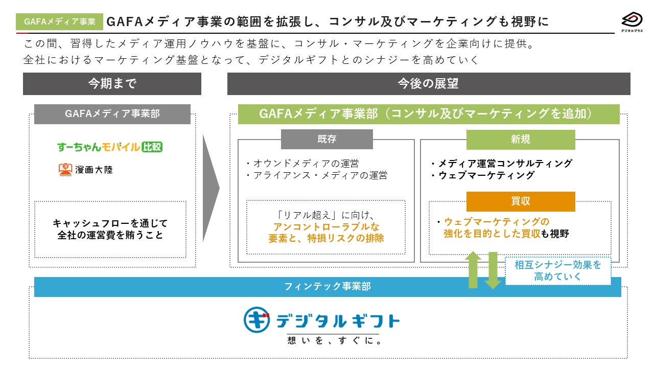 メディア買収及び新規立ち上げを行い、自社運営をメインに事業を展開しておりましたが、今後はメディア運営コンサルなどを含めたマーケティング機能を拡張し、全社におけるマーケティング基盤としての事業展開を推進、当社サービスのデジタルフィンテックとの事業シナジーを生み出し、さらなる成長を目指してまいります。