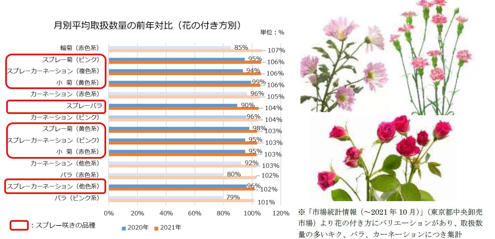 | 【本資料のポイント】 ■法人の花の活用方法が“ギフト”から“社員とのコミュニケーションツール”へ変化 ■個人用では、自家需要の増加やサブスクの登場で小型の花が求められる傾向に ■人気の花の色は黄色からニュアンスカラー・赤・ピンクに変化 ■母の日ギフトは原点回帰傾向で、カーネーション鉢の人気が復活。当社取扱実績も昨年の3倍へ ■観葉植物の需要増加で生育サイクルが合わず品薄状態。卸売平均価格も前年度比114%まで上昇 ■婚礼需要が復活し白花が品薄に ■花き関連企業や団体のSDGsへの取り組み事例 |