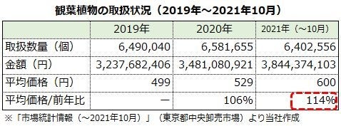 - 観葉植物は需要増加に生育サイクルが合わず品薄状態に。卸売平均価格も前年度比114%まで上昇。