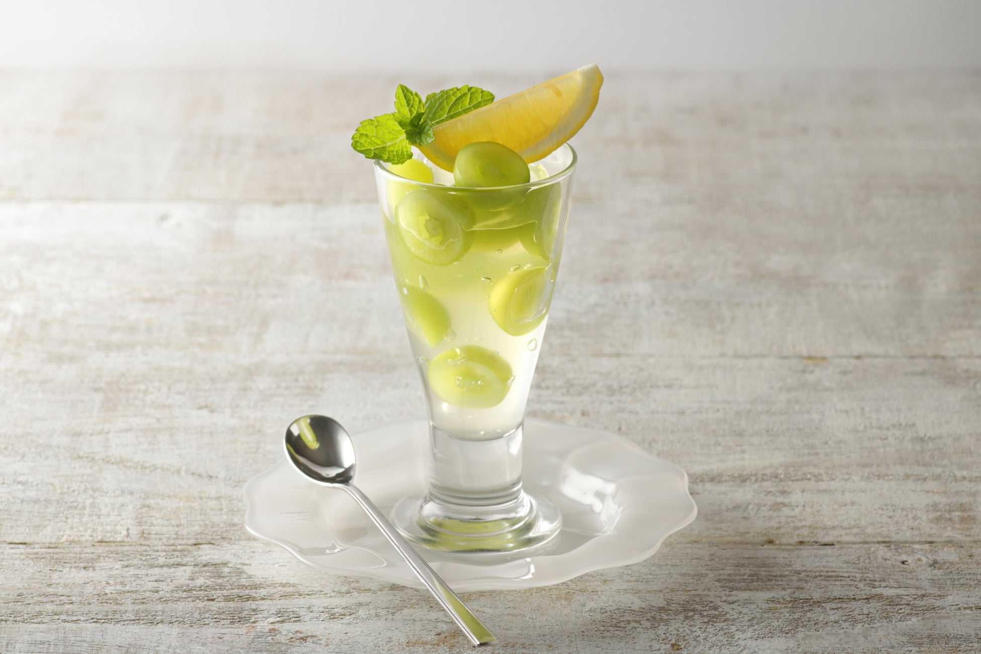 皮ごと食べられるシャインマスカットの食感がアクセント。トッピングしたミントとレモンのさっぱりとした香りが夏らしさを演出します。