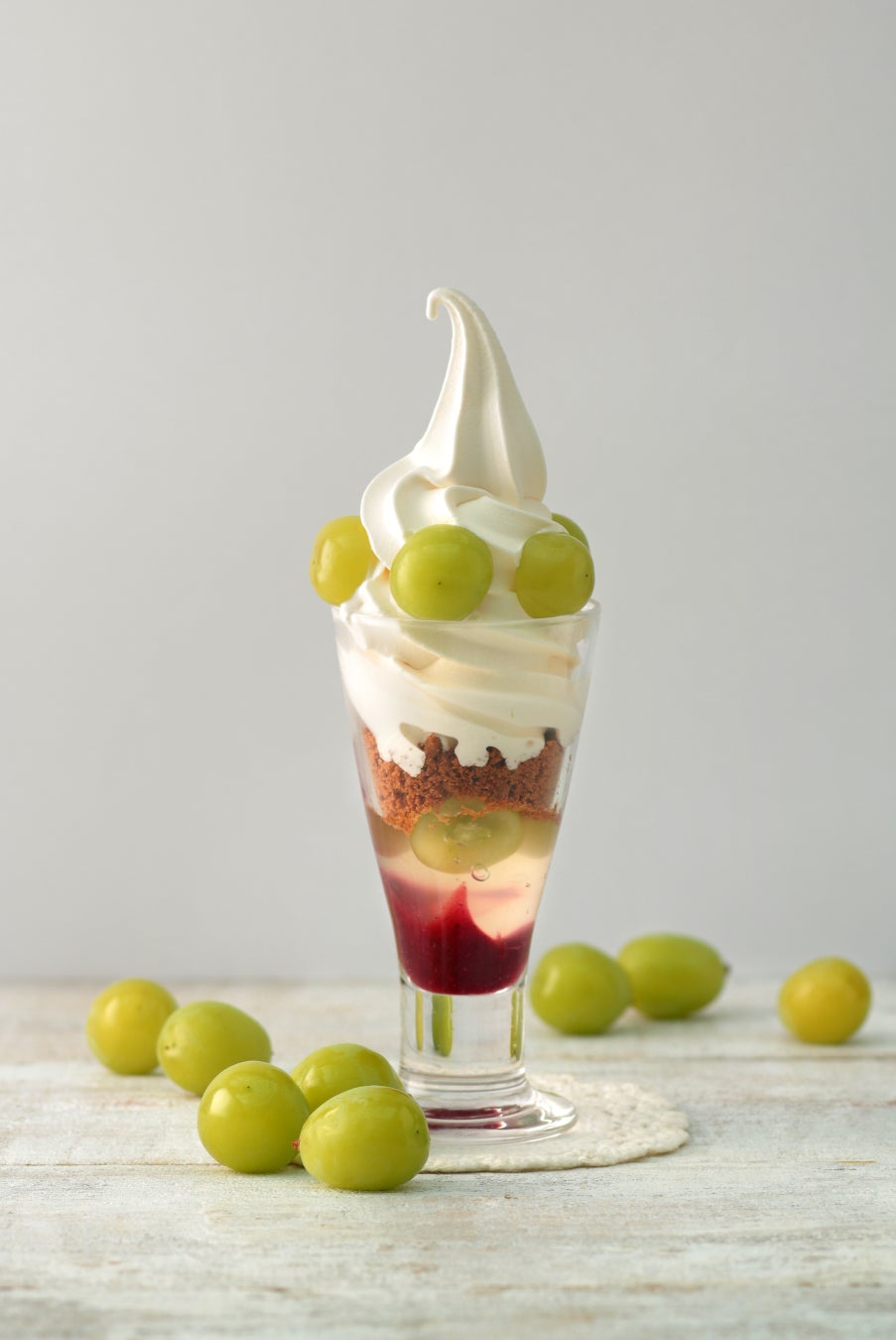 濃厚でまろやかな味わいの北海道ミルクソフトに、うきは産のみずみずしいシャインマスカットと甘酸っぱい自家製ベリーソース、さっぱりとしたレモンのジュレをあわせました。