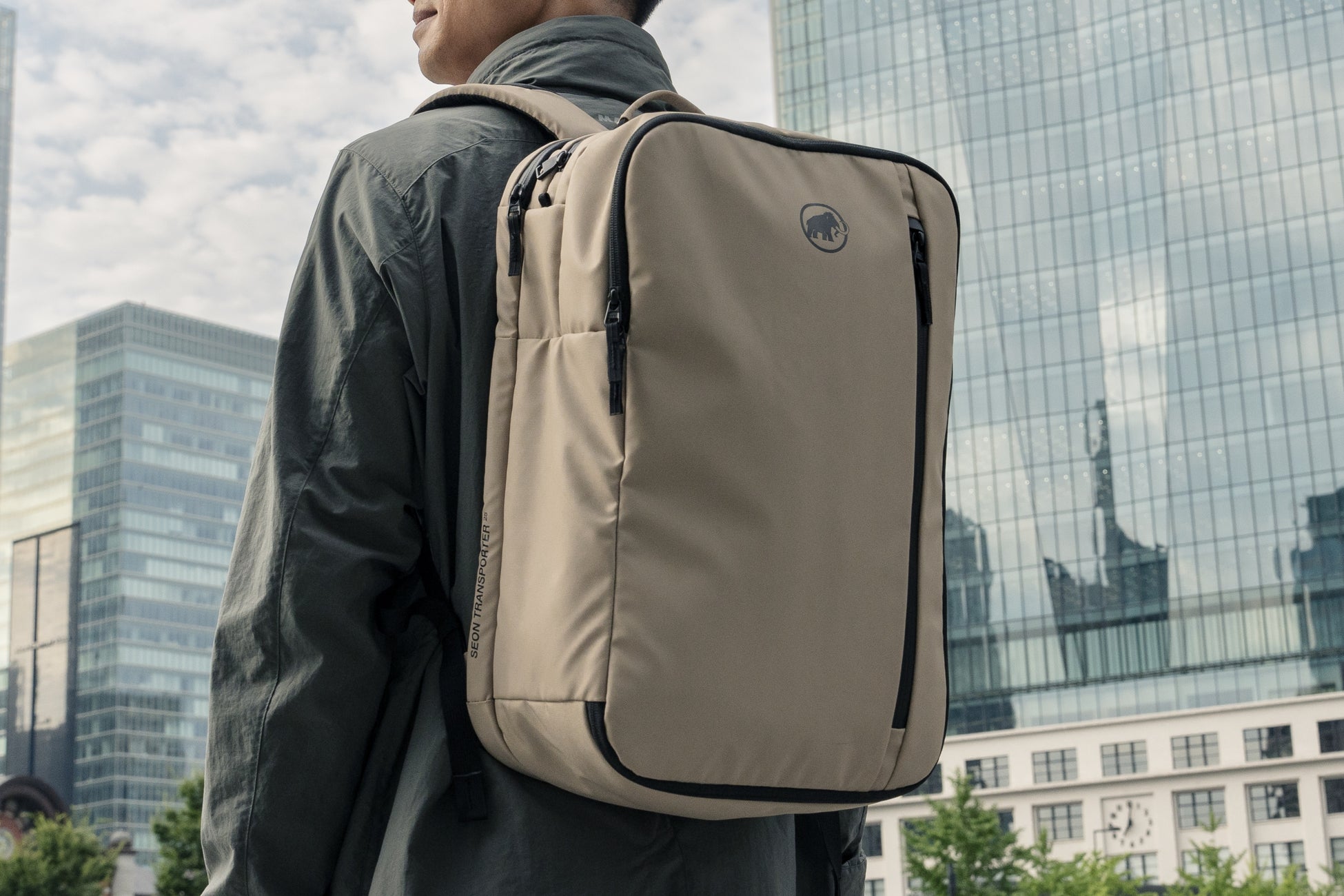「From Work to Climb」を体現するバックパック「セオン・トランスポーター( Seon Transporter)」。コンパートメントが「Work」スペースと「Climb」スペースに分かれており、収納する目的と物に合わせた設計になっています。また、ショルダーストラップには登山用でも使われるEVAパッドが使用され、重たい荷物を担いでも疲れにくい仕様になっています。背面には、目の細かいストレッチ生地を使用することで、スーツなど衣類との摩擦も少なく衣類が痛みづらい所もポイントです。PCを持ち運ぶ機会の増えた昨今では、背負いやすさと収納力の高さから男女問わず人気のモデルとなっております。