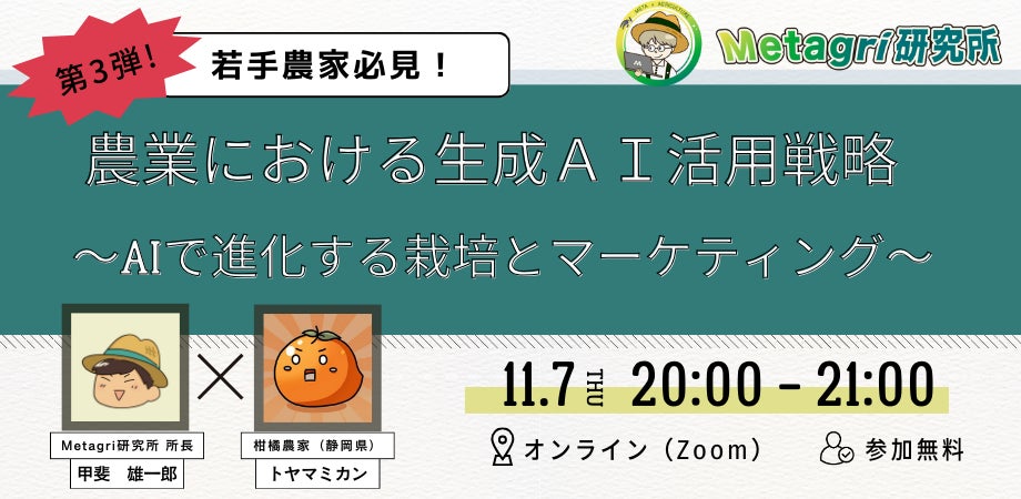 農業web3コミュニティ「Metagri研究所」(運営:株式会社農情人、本社:千葉県船橋市、代表取締役:甲斐雄一郎)は、2024年11月7日にオンラインセミナー「農業における生成AIの実践活用~AIで進化する栽培技術とマーケティング~」を開催します。