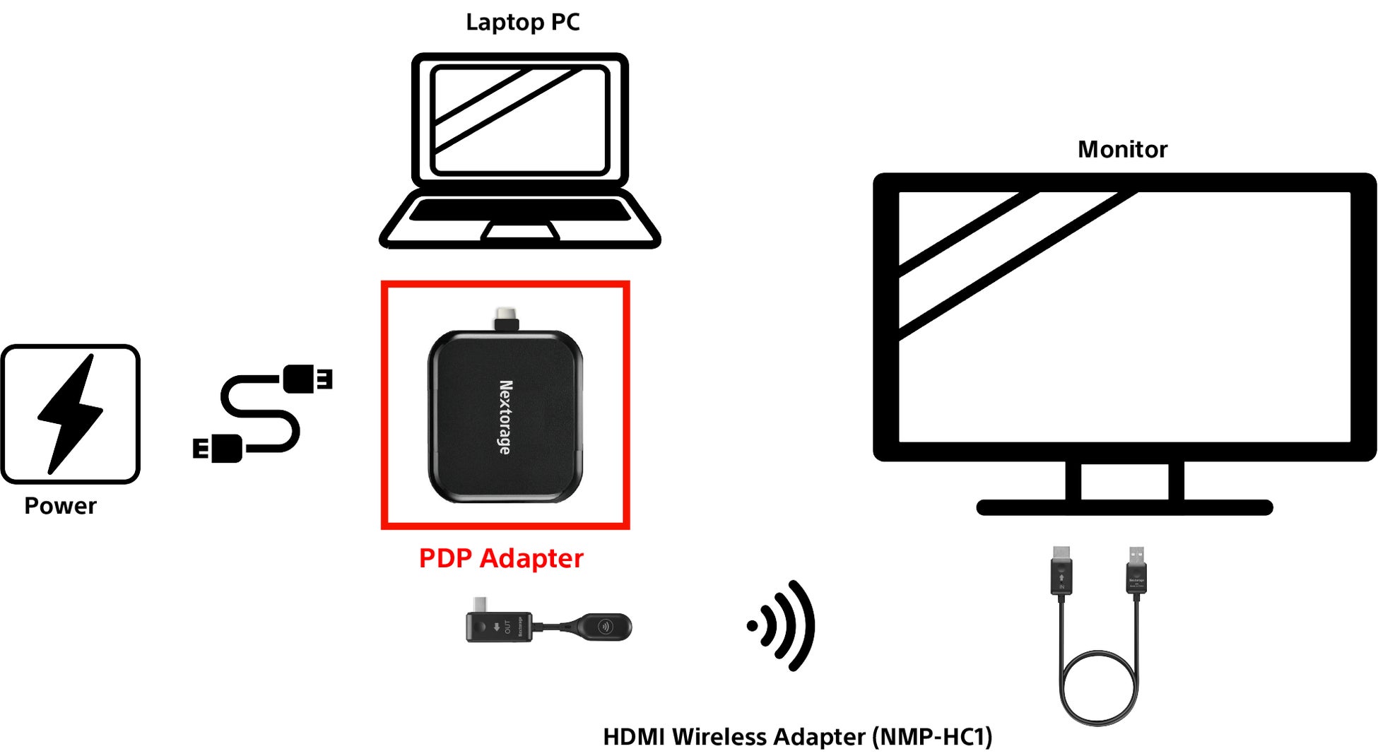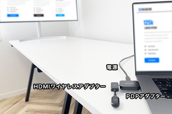 USB-Cに外部出力に対応したノートパソコンからHDMIワイヤレスアダプターを使用してモニターに投影する場合、ノートPCのUSB-CポートにPDPアダプターを介して、電源とHDMIワイヤレスアダプターを同時に接続。プレゼンが長くなってもノートPCのバッテリー切れを気にすることなく、資料を投影できます。