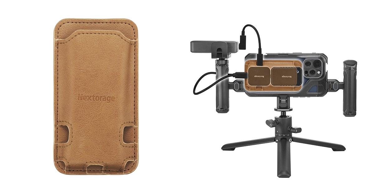 今回支援品に追加した専用ケースは、PDPアダプターとポータブルSSD NX-P2SE/NX-P2SE GをiPhone**に接続する際、MagSafeでiPhone背面に付けて使用できる PUレザーケースです。