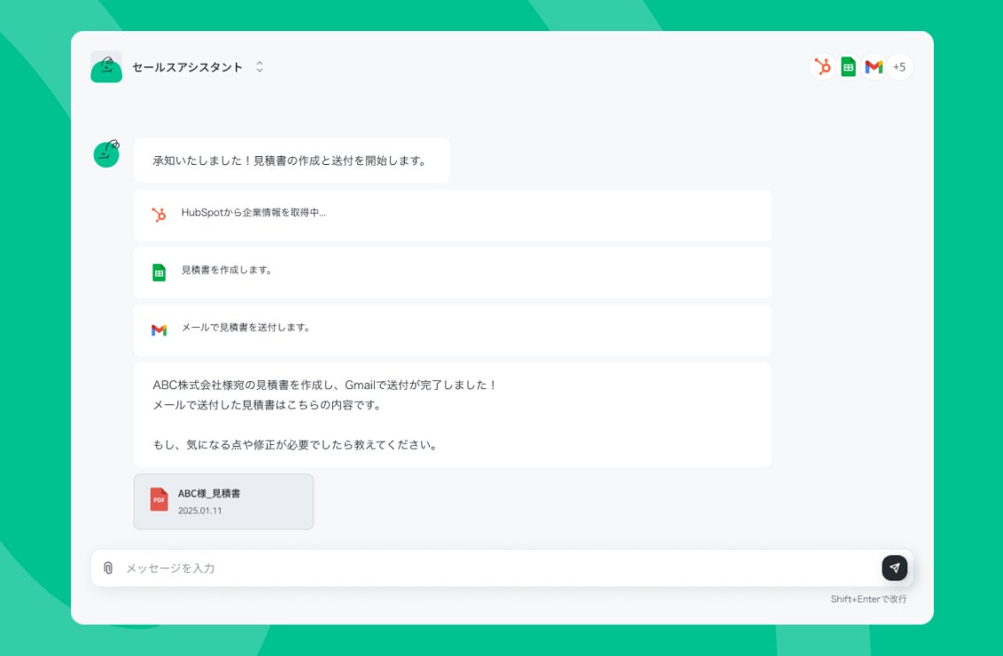 見積書や契約書などの書類を作成し、作成した書類をメールや電子契約ツールなどで自動的に送信します。また、商談前の企業リサーチや、商談後の議事録作成・CRMの更新など、営業活動に付随する事務作業を幅広く自動化します。