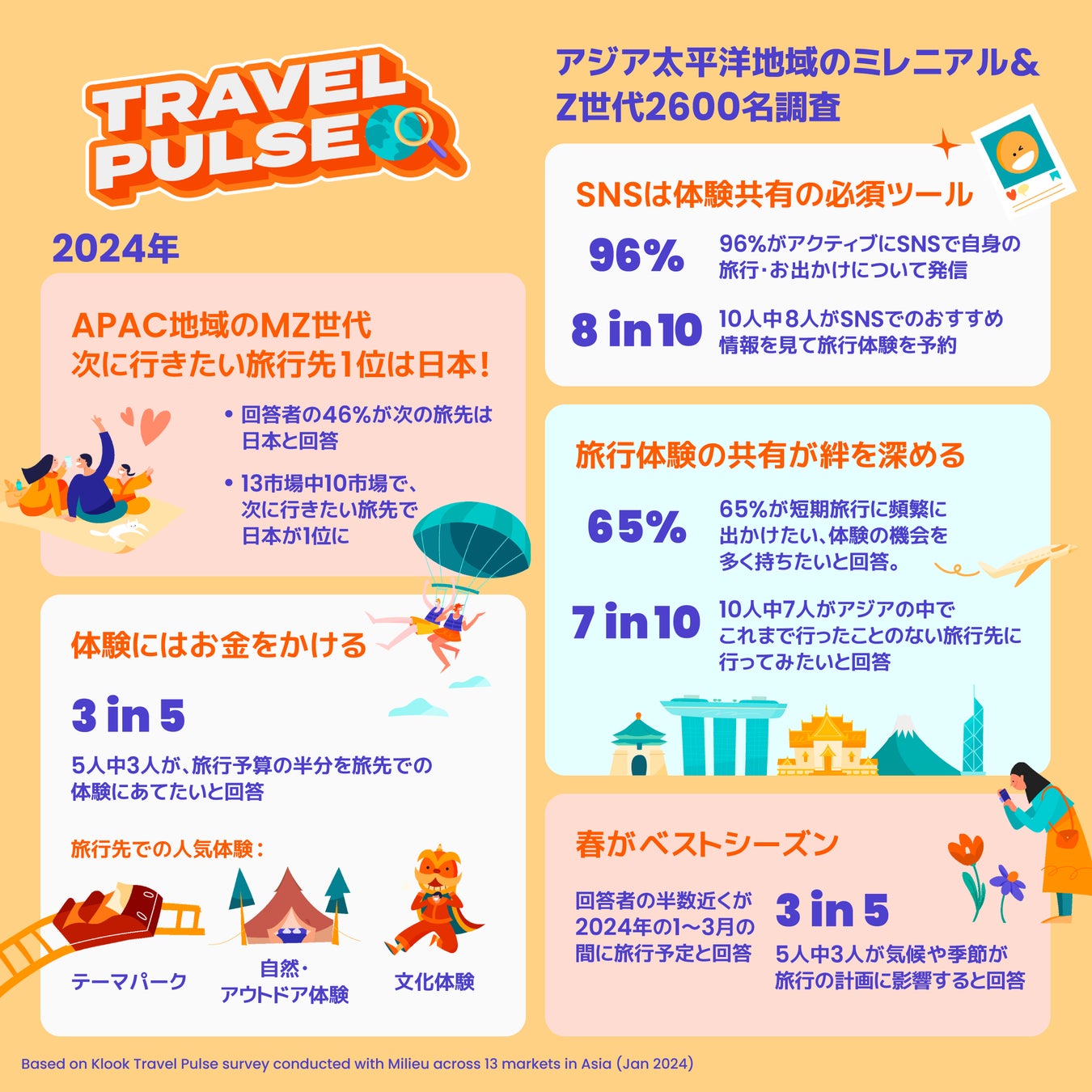 しかし、嗜好は市場によって異なり、例えばマレーシアとインドネシアの旅行者は春を最も好むという結果でしたが、オーストラリアとフィリピンの旅行者は夏の旅行を好むという結果でした。また台湾と韓国は秋の紅葉を好み、インド、タイ、シンガポールの旅行者は冬に注目していました。体験とSNSが、旅行者がこの新たな愛情表現としての方法として促進する2024年、Klookは新しい目的地や楽しみ方に向かって、旅行への新たな熱意の年になると予想しています。