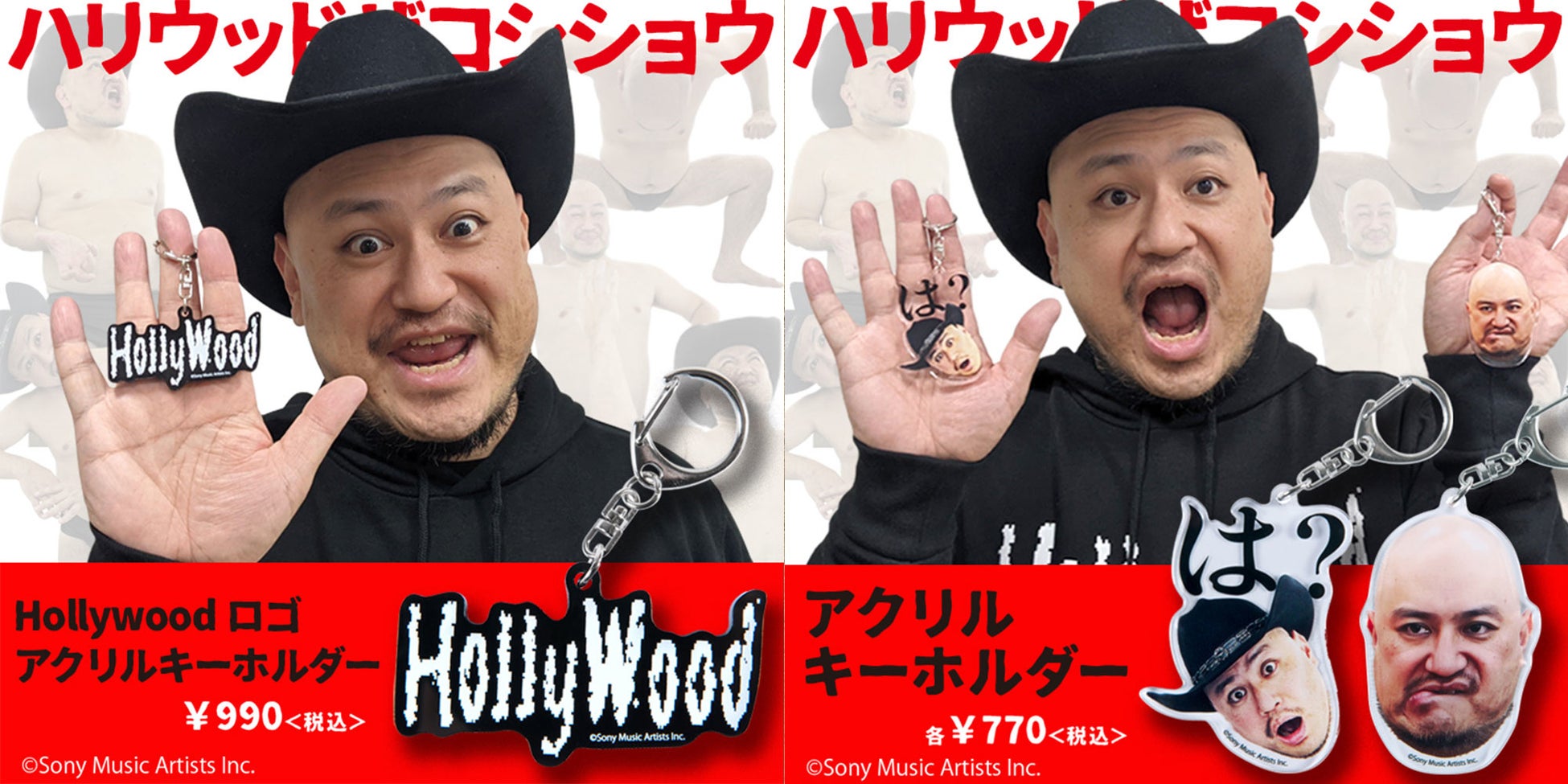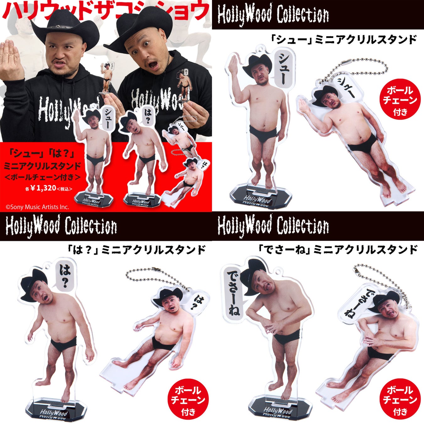 ハリウッドザコシショウがいつも着用しているHollywoodロゴを使い、リバーシブルスカジャンやパーカーやニットキャップ、エコバッグなど様々なグッズを展開。また本人をモデルにしたアクリルスタンドやアクリルキーホルダーなど制作。