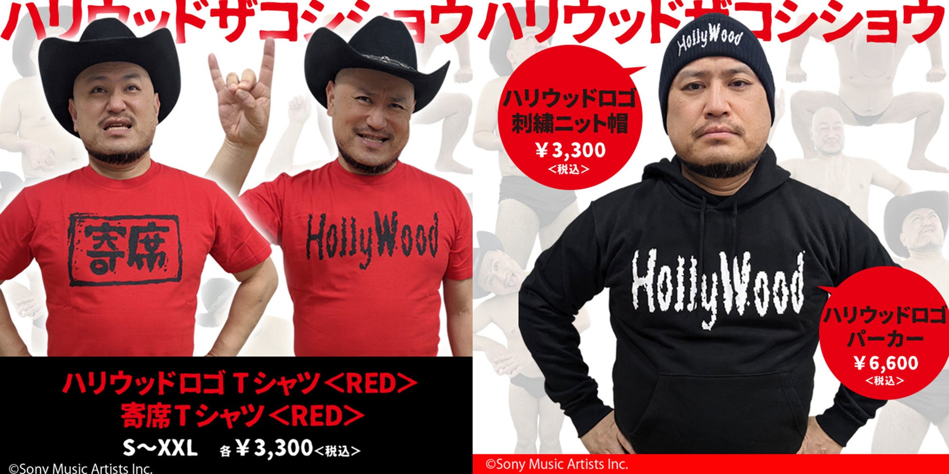 定番Hollywoodロゴとおなじみ寄席ロゴを始め、ザコシショウyoutubeで大人気の「東京喚き倶楽部」Tシャツや、しょんぼり顔にシューーーーなグッズもあるぞ!