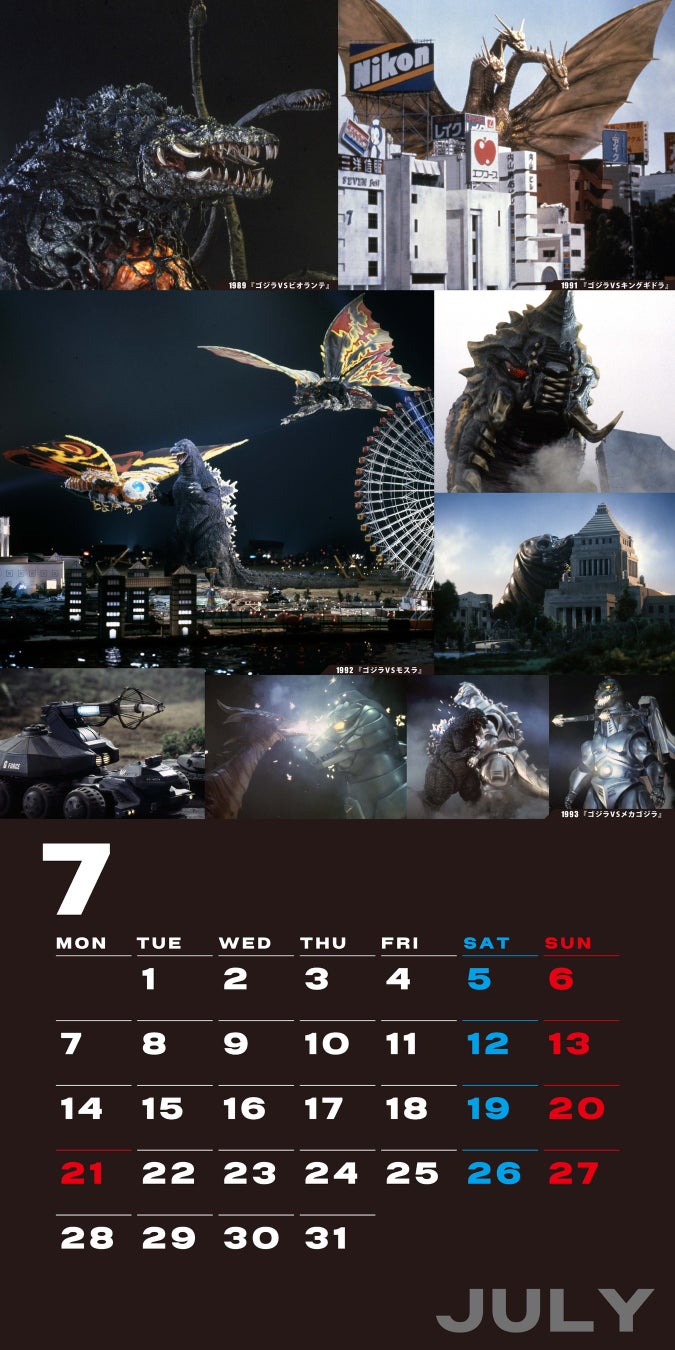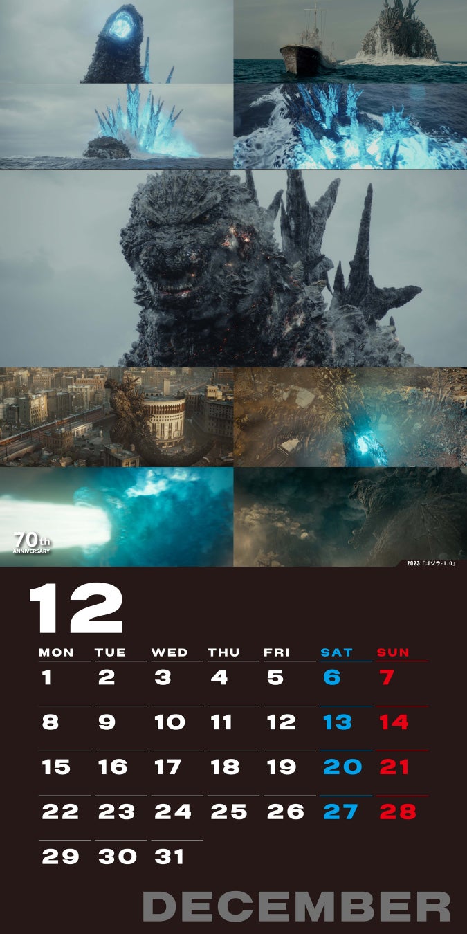 本カレンダーには、70年の歴史にわたるゴジラの名場面を彩るビジュアルが満載です。