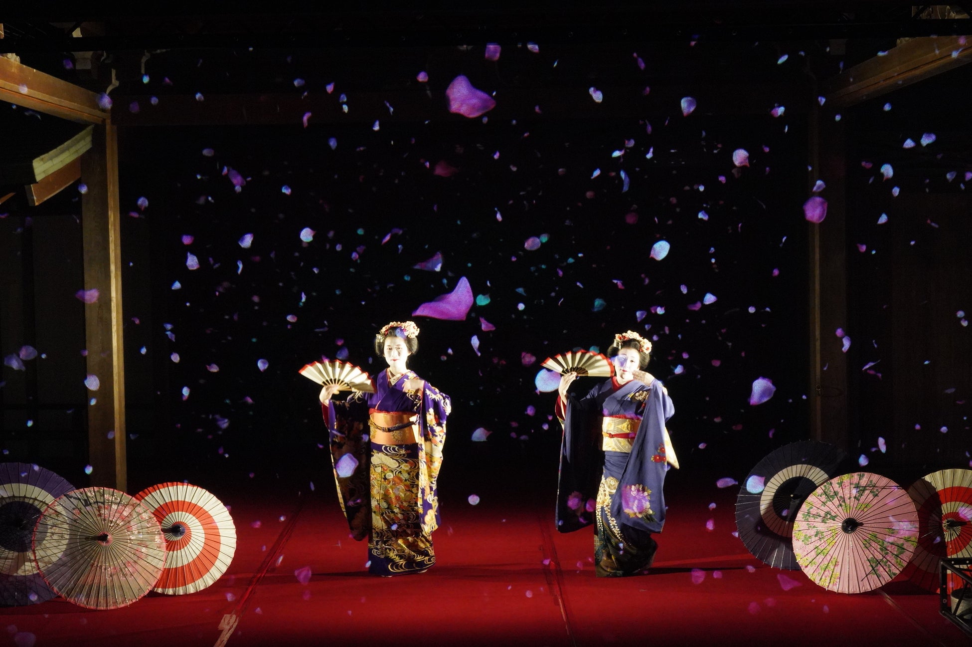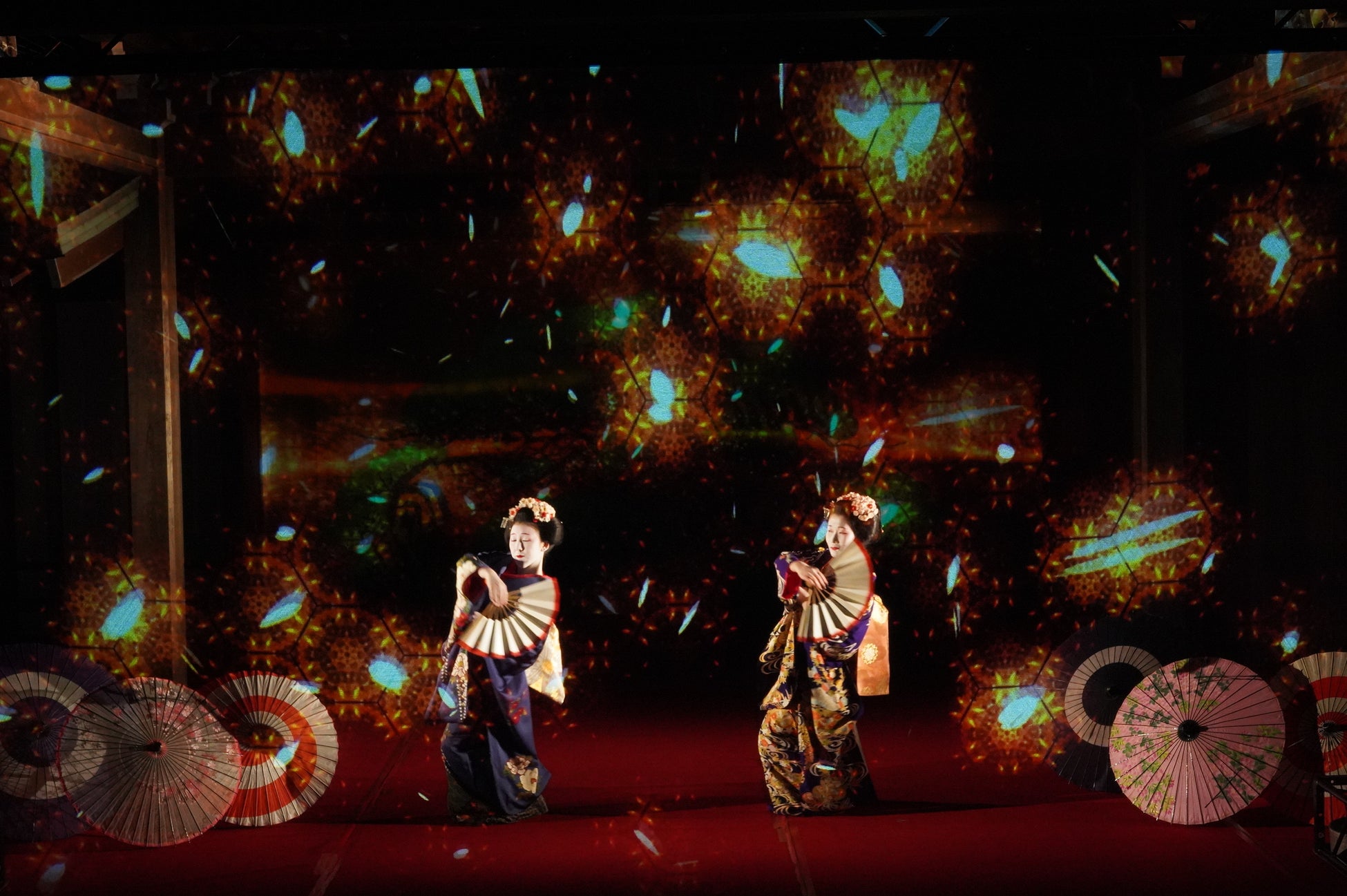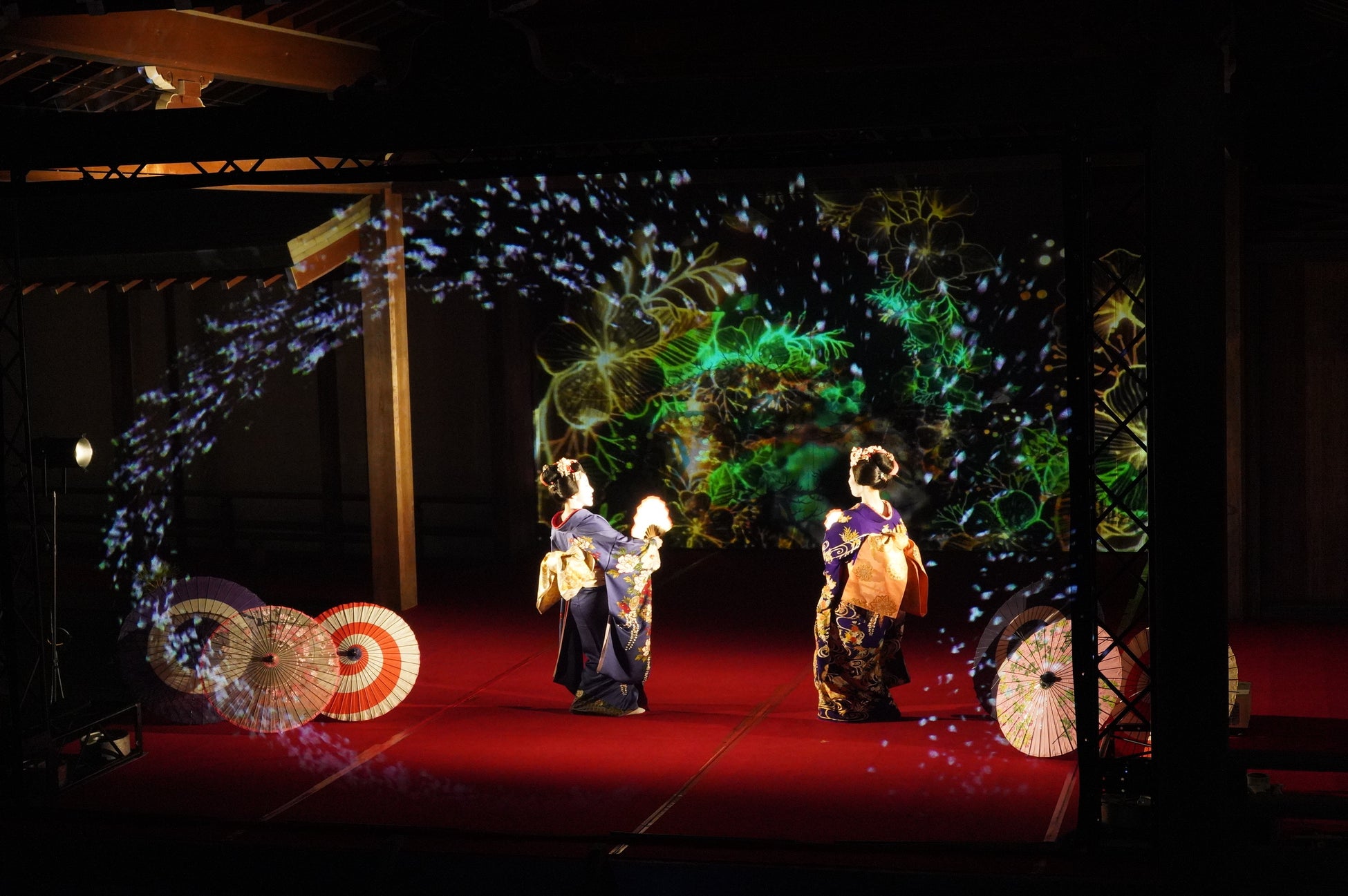 伝統的な構造の能舞台をいかし、能舞台前面のホログラムスクリーンへのプロジェクション映像と老松が描かれた鏡板へのプロジェクション映像、そして本舞台での舞妓による日本舞踊を連動させた演出により、日本の伝統文化とデジタル技術が調和した新しいアート空間の創出を目指しました。