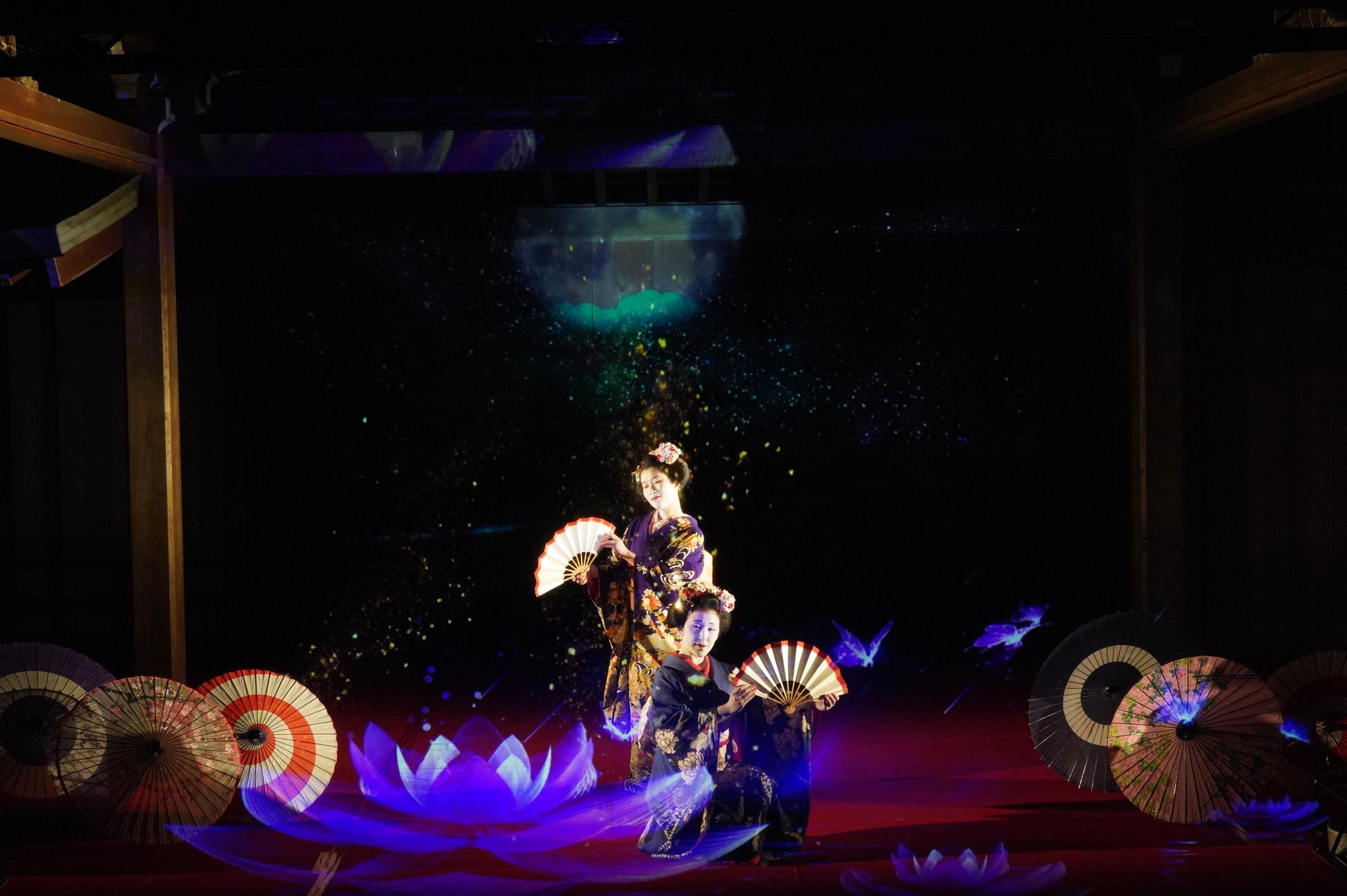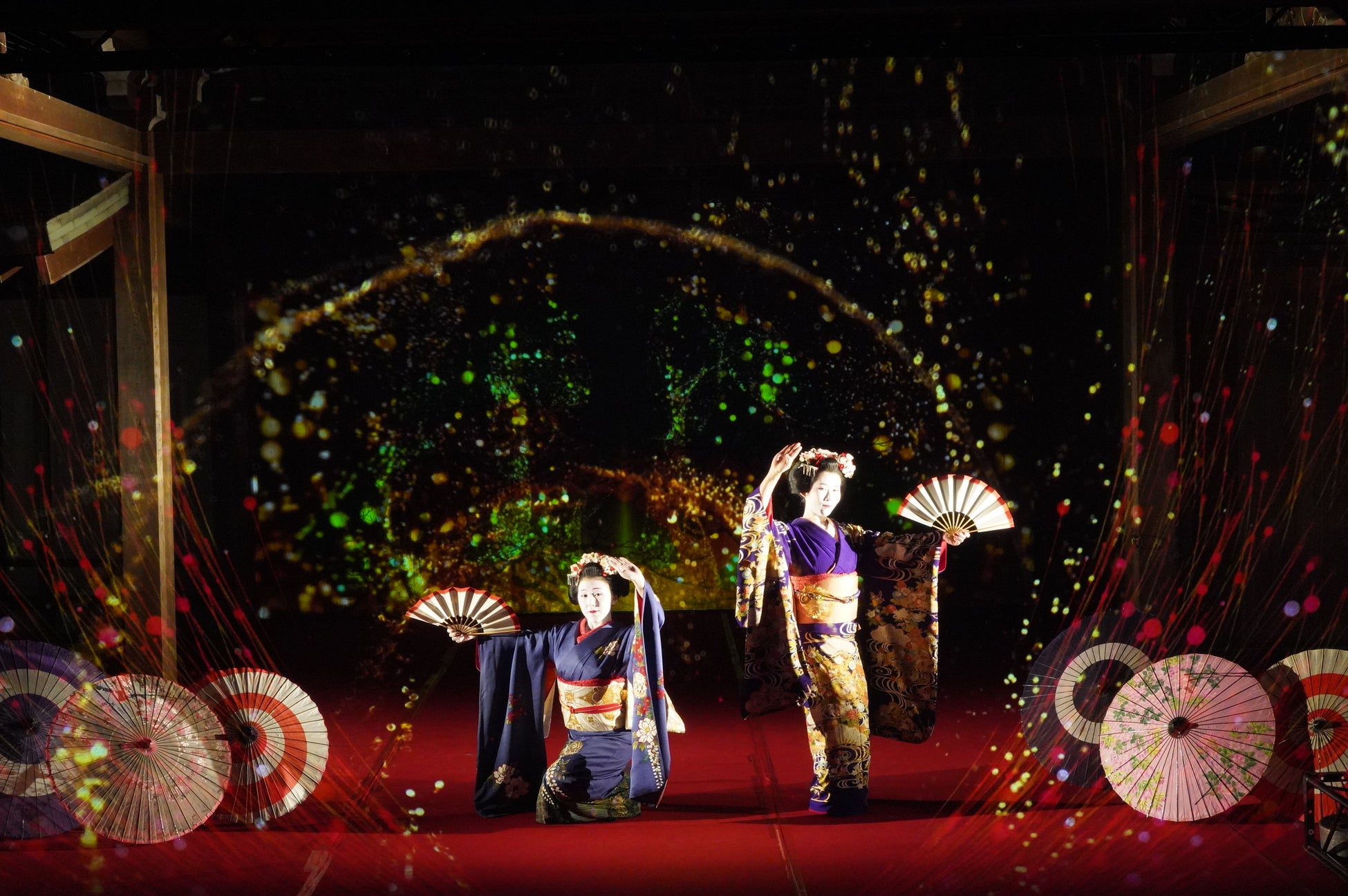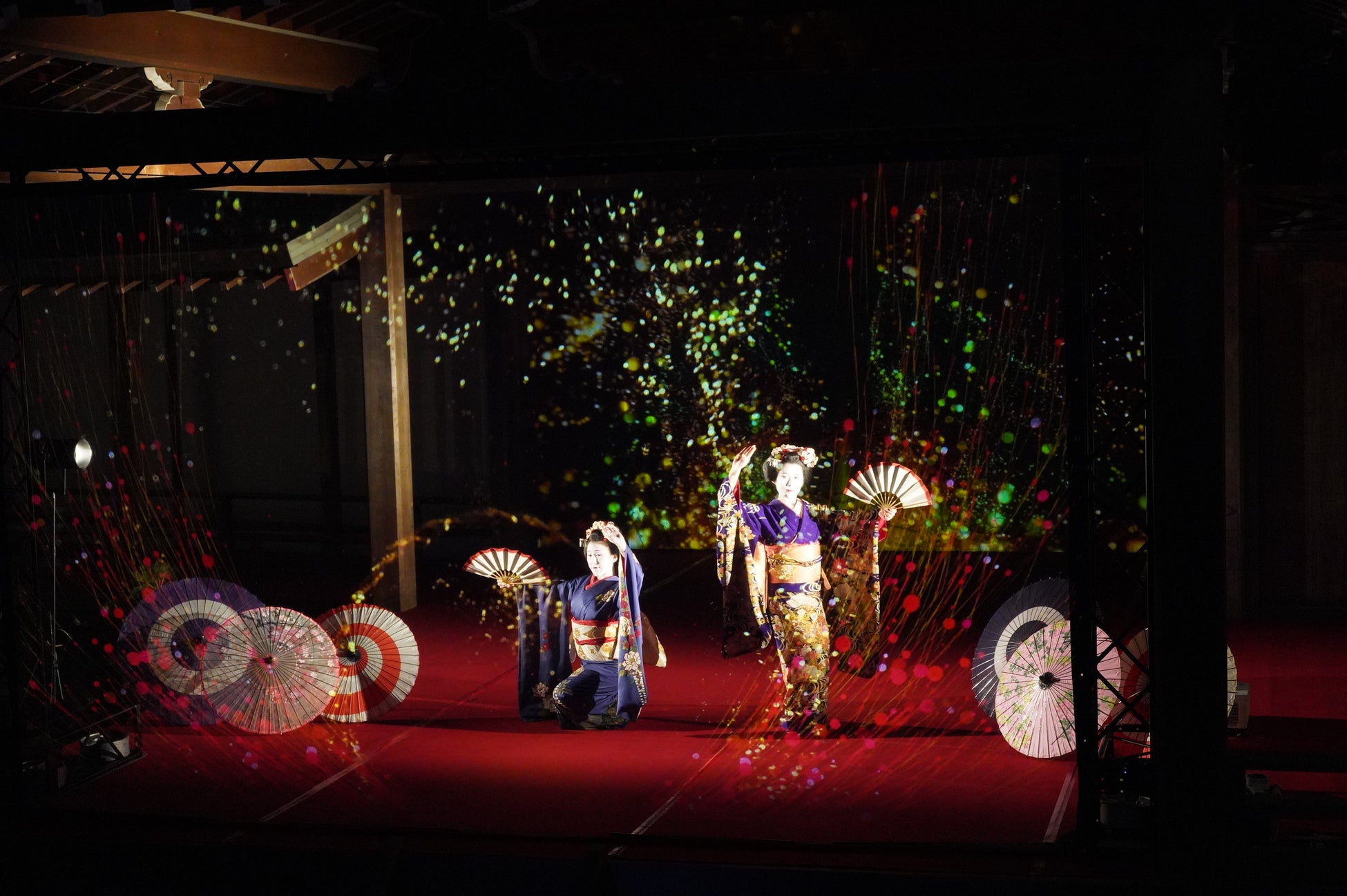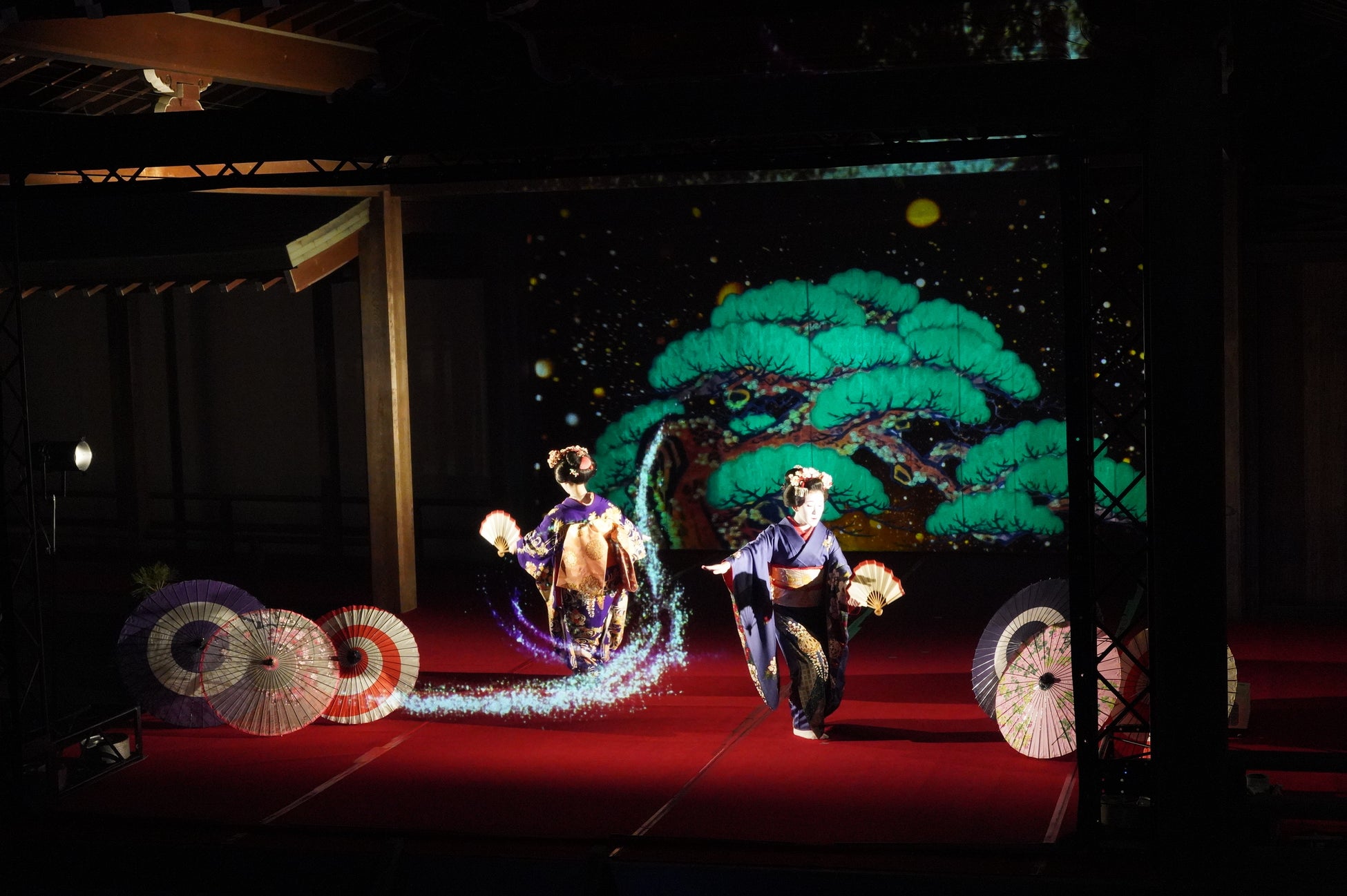 能舞台前面のホログラムスクリーンへの投影映像と老松が描かれた鏡板への投影映像、本舞台での舞妓による日本舞踊を連動させた演出で、日本の伝統文化とデジタル技術が調和した新しいアート空間を創出。