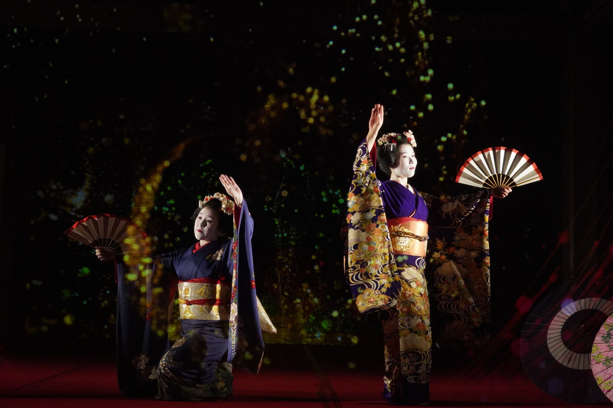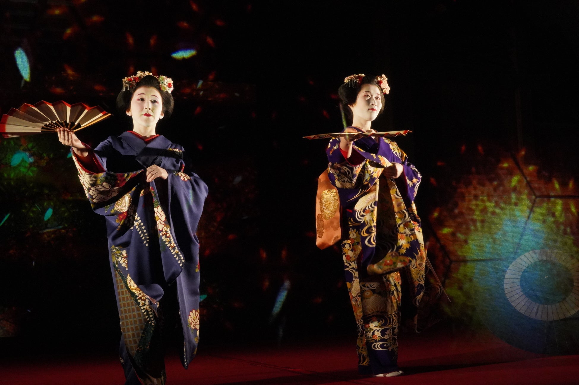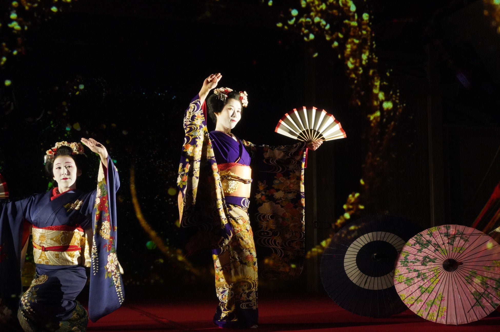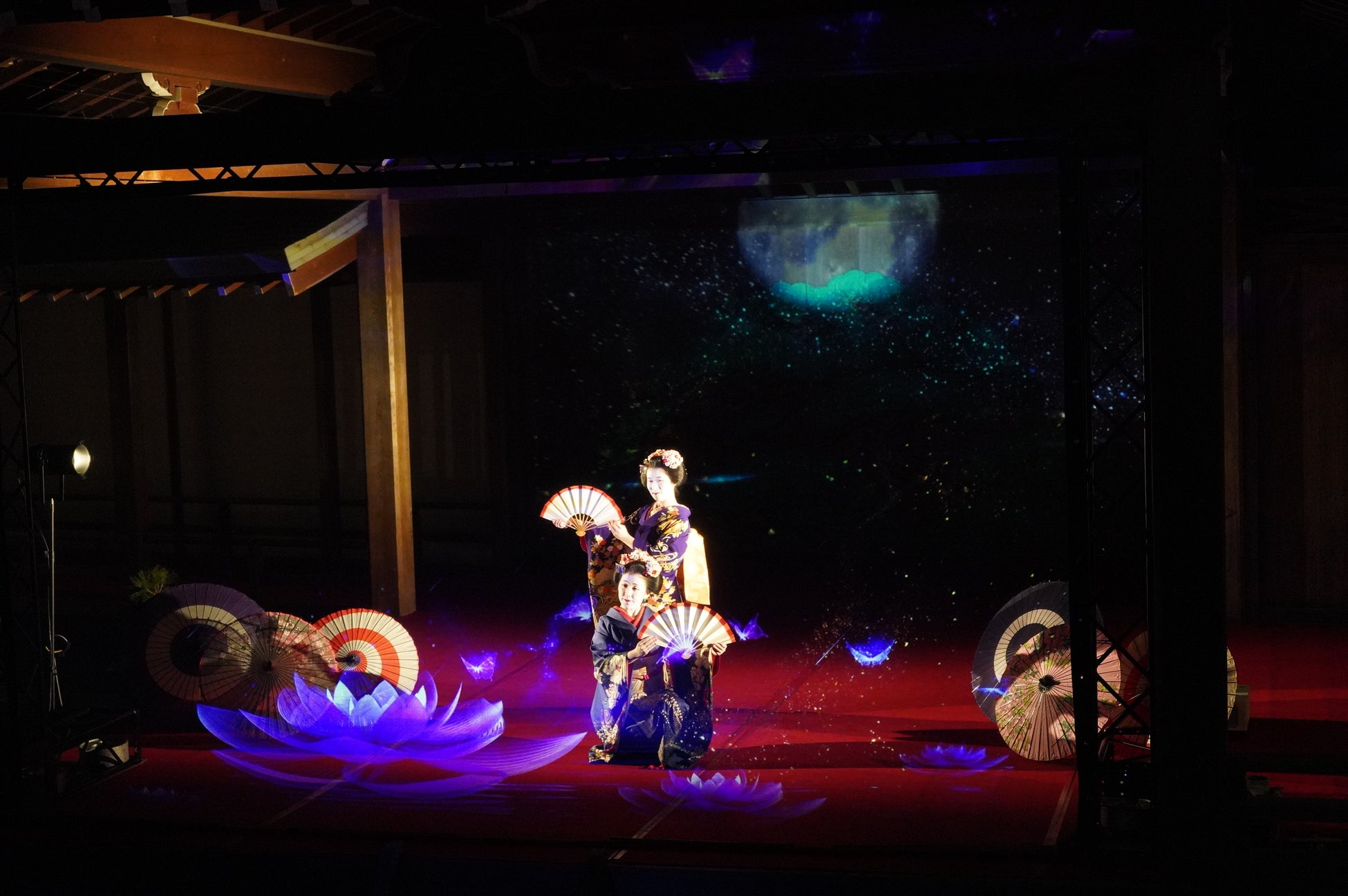 能舞台前面のホログラムスクリーンへの投影映像と老松が描かれた鏡板への投影映像、本舞台での舞妓による日本舞踊を連動させた演出で、日本の伝統文化とデジタル技術が調和した新しいアート空間を創出。
